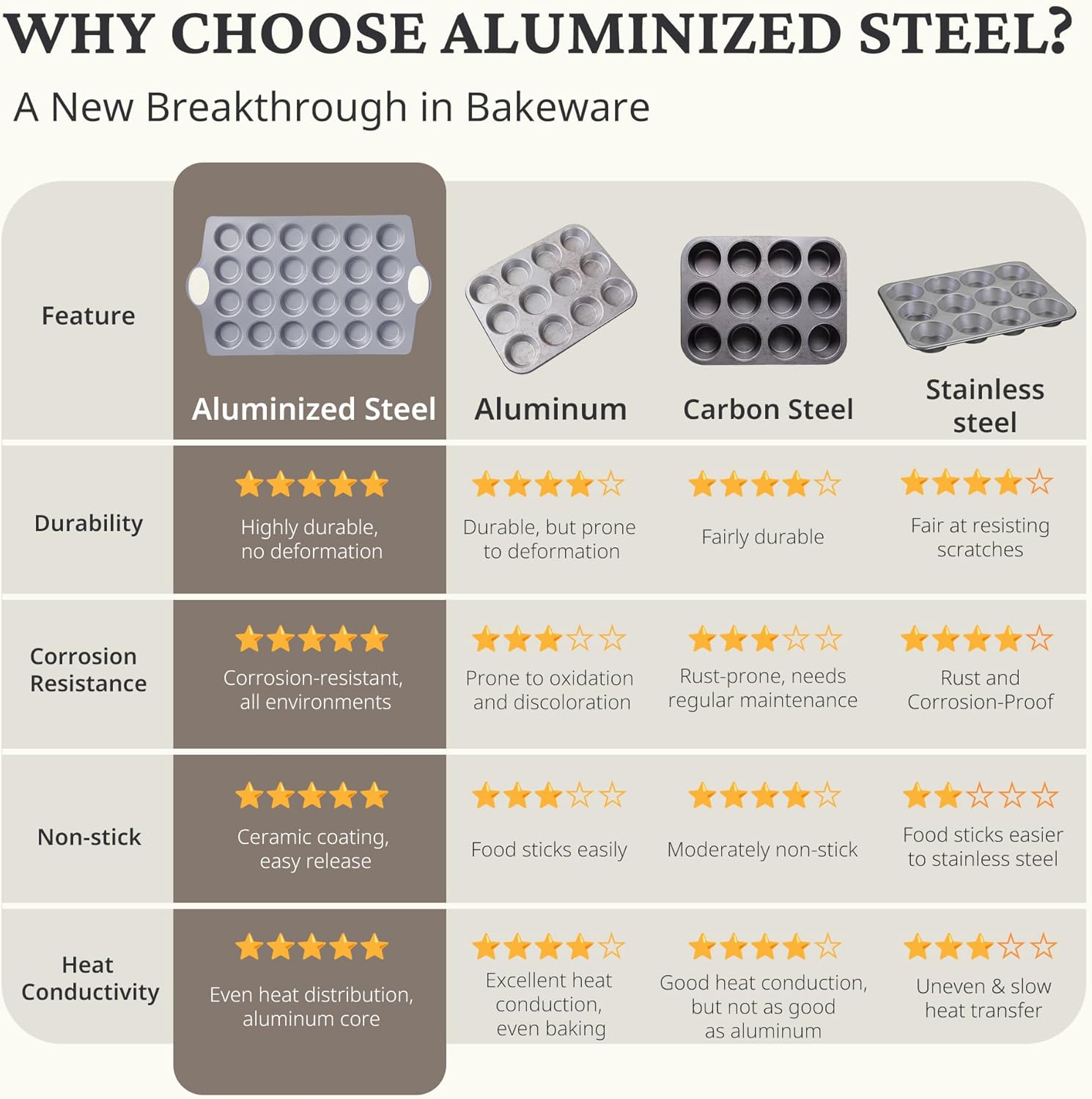 - Heavy-Duty Aluminized Steel: Mini muffin pan and mini cupcake pans are made from highly durable aluminized steel, offering 50% better corrosion resistance and durability compared to traditional muffin pans. The even heat distribution significantly shortens baking time and can withstand temperatures up to 500°F. Suitable for use in ovens, dishwashers, refrigerators, and freezers, greatly enhancing convenience.