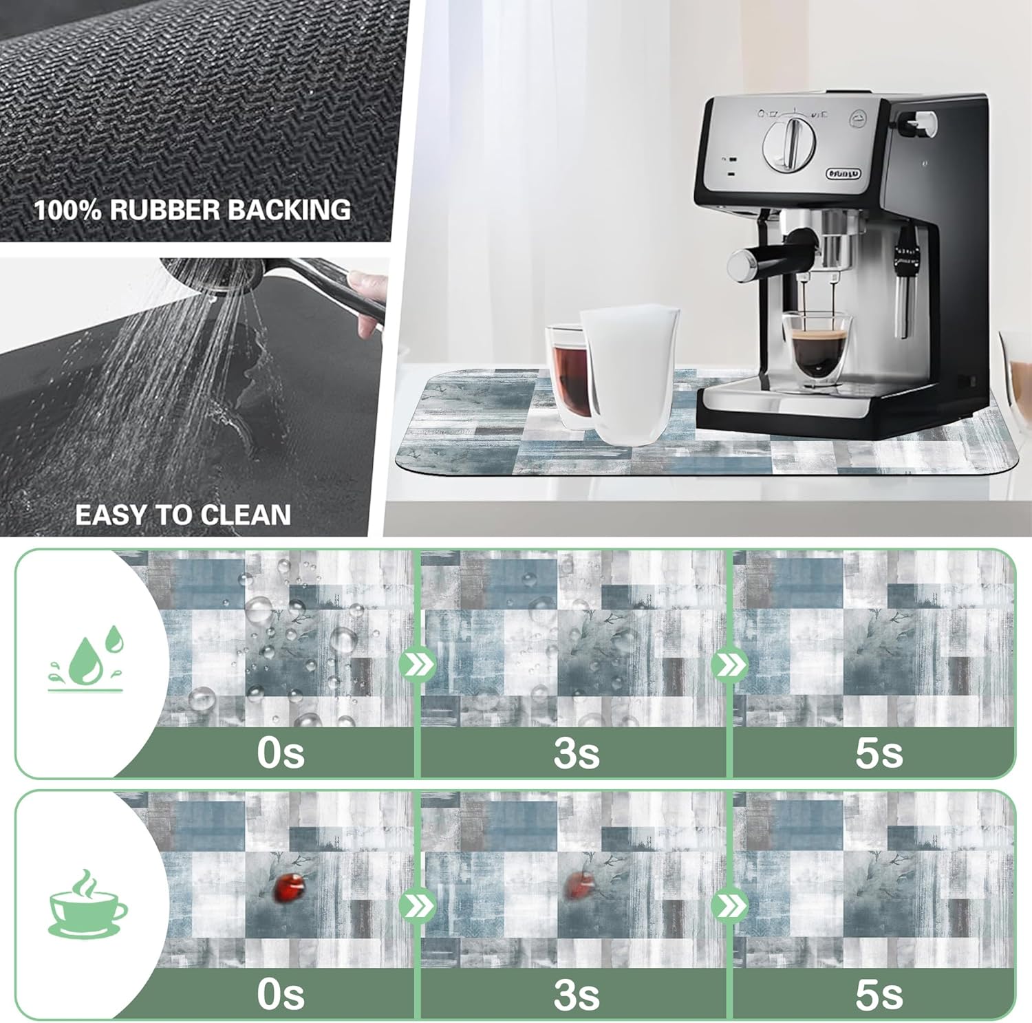 - 【Super Absorbent and Non-slip】The dish drying mat is made of absorbent suede and non-slip rubber. The surface is soft, wear-resistant and heat-resistant, and can quickly absorb water droplets from dishes. The non-slip textured rubber backing can firmly grip the counter, and dishes, water cups, coffee machines and kitchen utensils will not slide when placed on it. Perfect as a kitchen or coffee bar accessory.