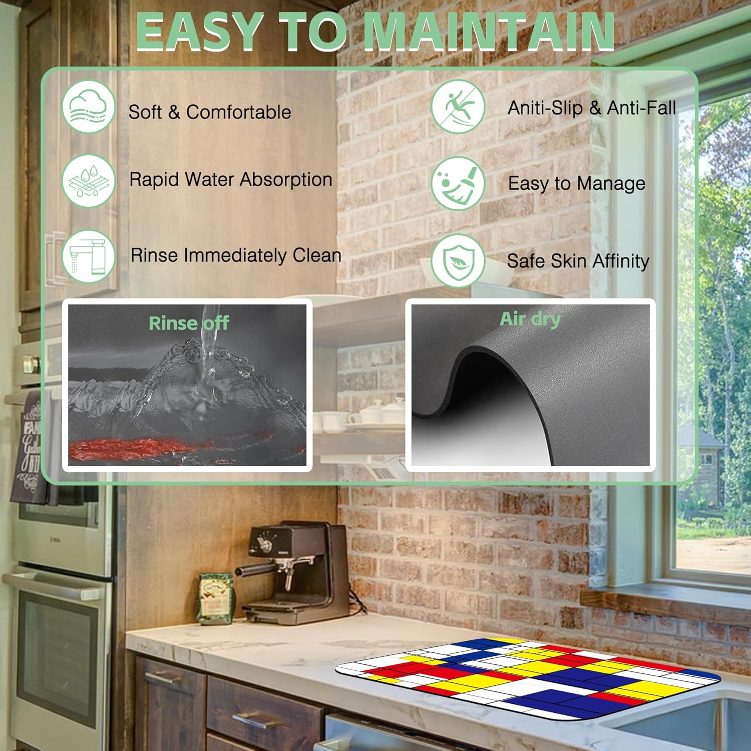 - 【Hide Stains & Easy to Clean】Our dish drying mat, the surface material porosity is up to 85%, which can quickly absorb stains. The dish drying mat can be washed by hand or machine to remove stains, it will not fade after repeated washing, and can be reused many times, due to the high-definition printed suede with excellent color locking effect, please do not use bleach to clean the mat.