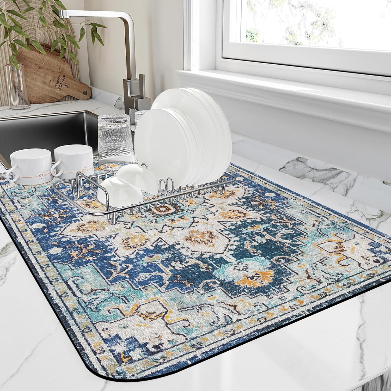 Bohemian Textile Rug Texture Dish Drying Mat,12"X19" Absorbent Fast Dish Drying Mat for Kitchen Counter Pot and Pan, Kitchen Accessories