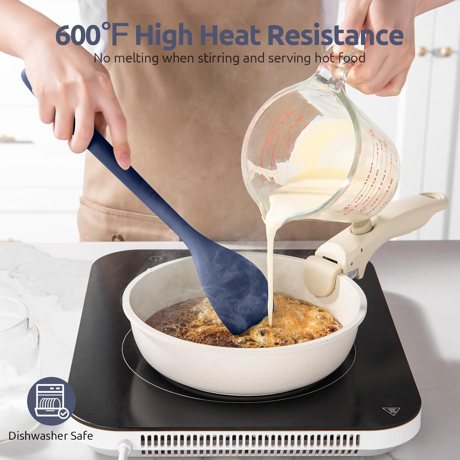 - [Scratchproof Silicone Tip Safe with Non-Stick Cookware] Using a kitchen silicon spoon is necessary so as to not scratch the coating of non-stick pots and pans. These spoons come with a soft silicone tip. They are gentle on the stick-free surface to spare any damage to your fancy frypans or cookpots. If you are getting tired of the scratching sound by metal spoons, U-Taste mixing stirring kitchen spoon will be a great choice. The silicone handle provides a nice soft grip as well.