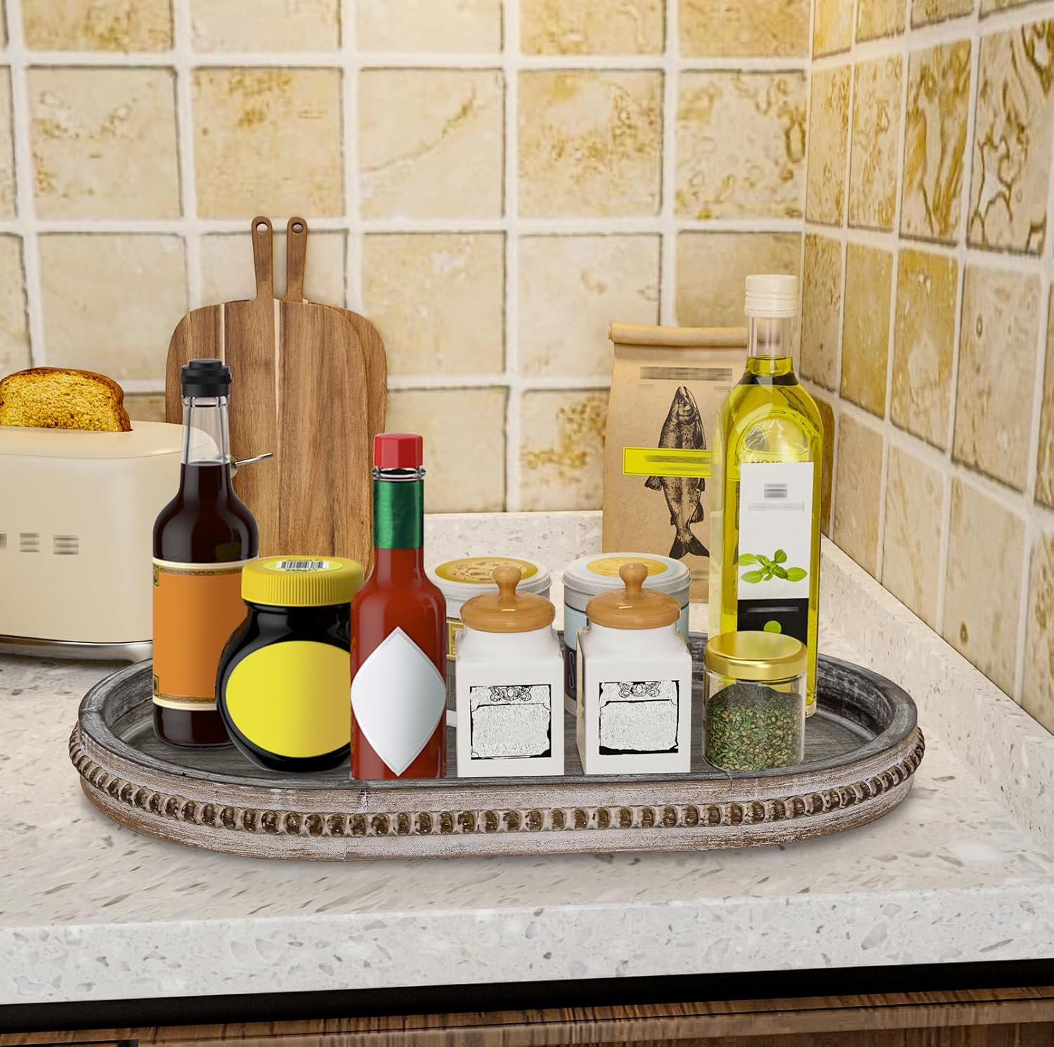 - REFINED AND ELEGANT: Oval serving tray is vintage brown finish and the edges are decorated with wooden beads, the distressed surface gives it a homey vintage feel. The overall appearance is unique and exquisite that goes well with many types of decor, create a fun centerpiece for your space.