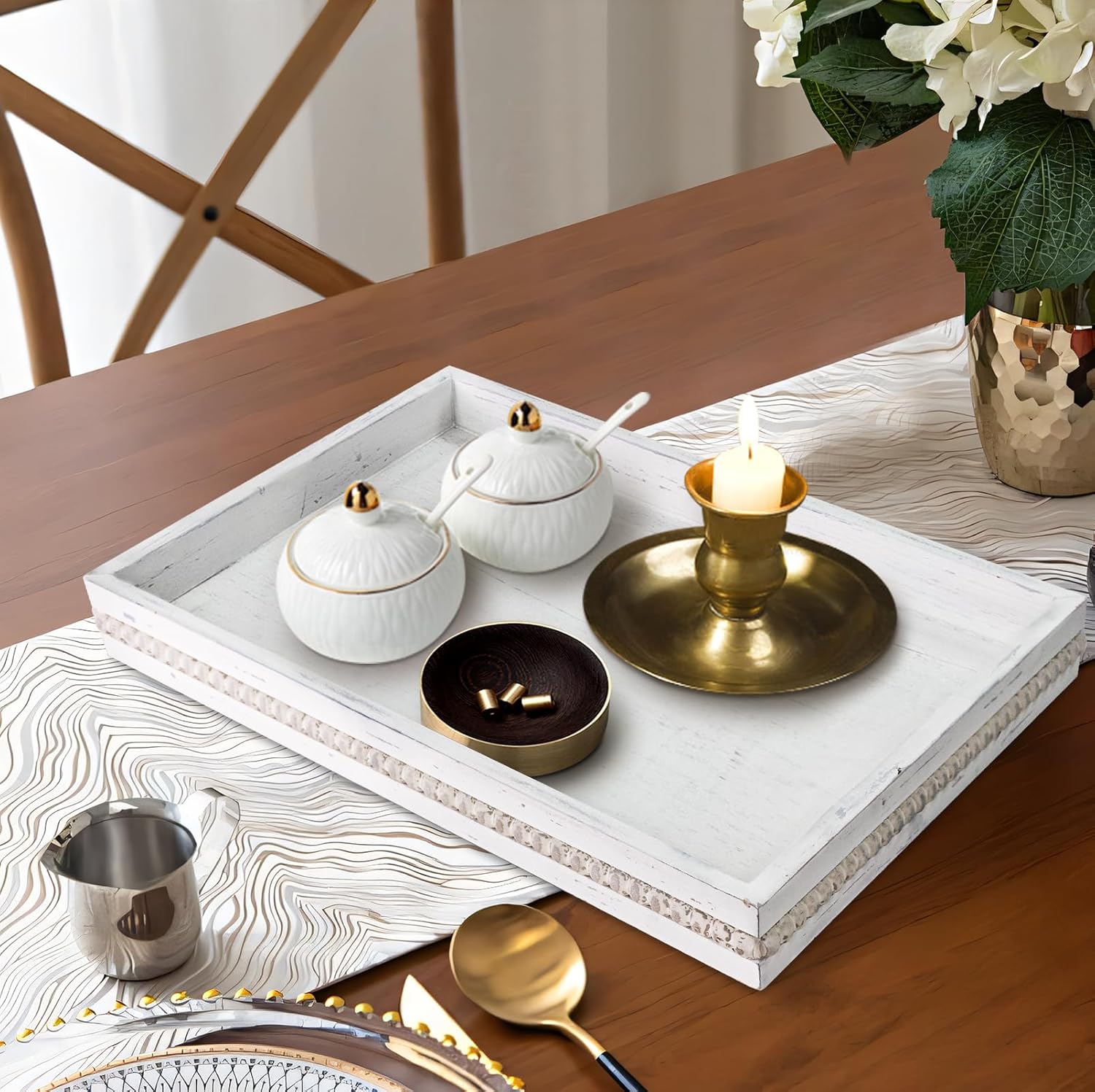 - REFINED AND ELEGANT: Rectangle serving tray is vintage white finish and the edges are decorated with wooden beads, the distressed surface gives it a homey vintage feel. The overall appearance is unique and exquisite that goes well with many types of decor, create a fun centerpiece for your space.