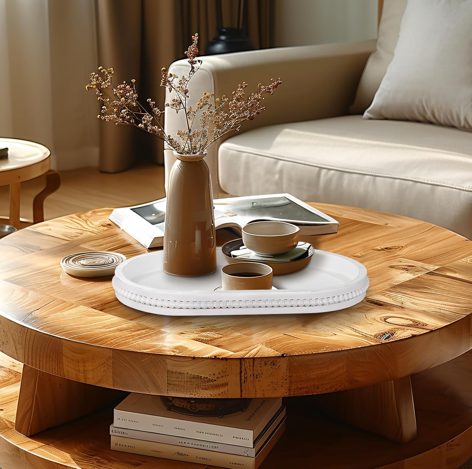 MAONAME Wood Serving Tray, Farmhouse Wooden Tray for Coffee Table, Oval Beaded Trays, White Decorative Trays for Living Room, Kitchen, 15" X 9" X 1.2"