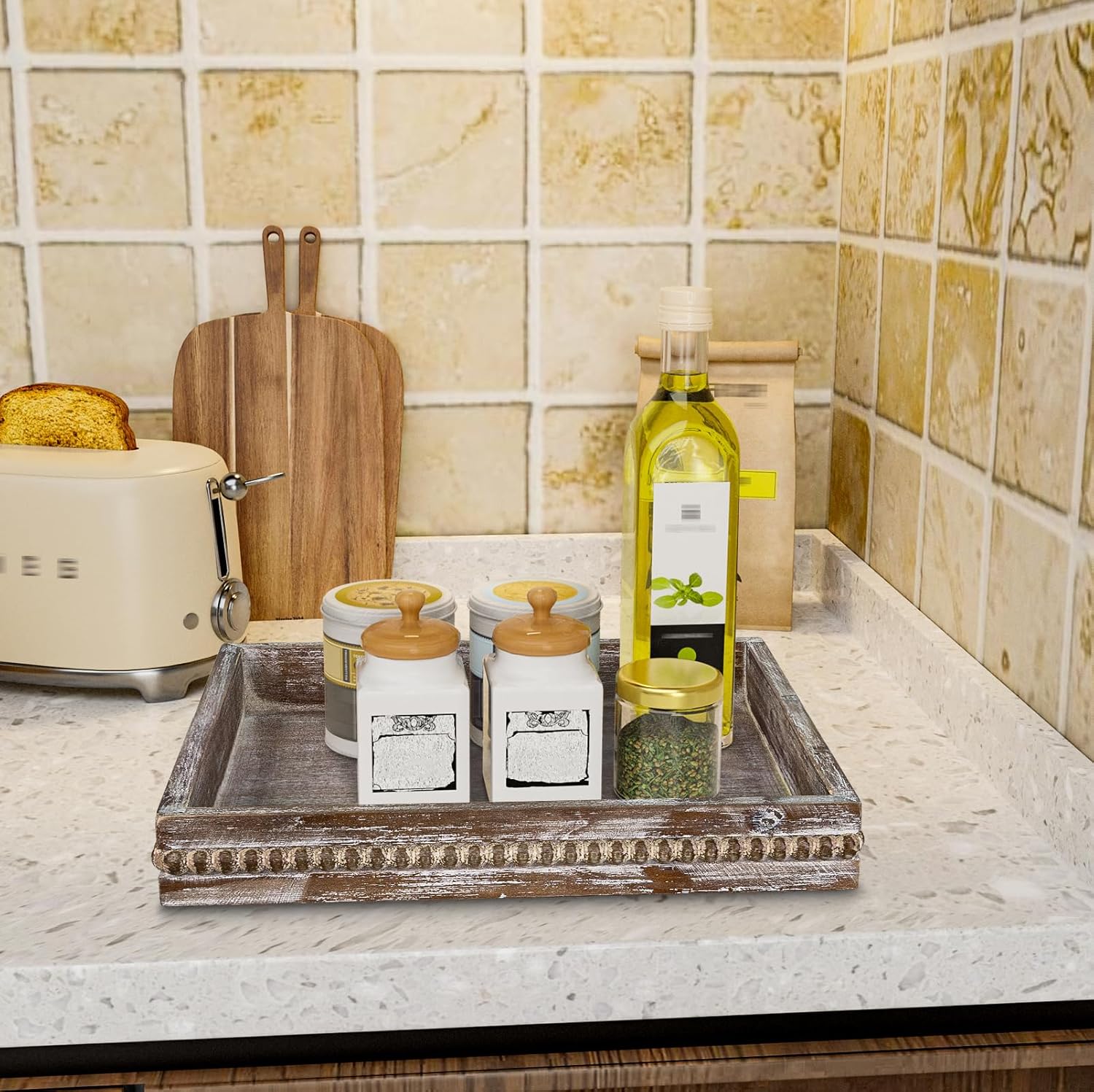 - REFINED AND ELEGANT: Square serving tray is vintage brown finish and the edges are decorated with wooden beads, the distressed surface gives it a homey vintage feel. The overall appearance is unique and exquisite that goes well with many types of decor, create a fun centerpiece for your space.