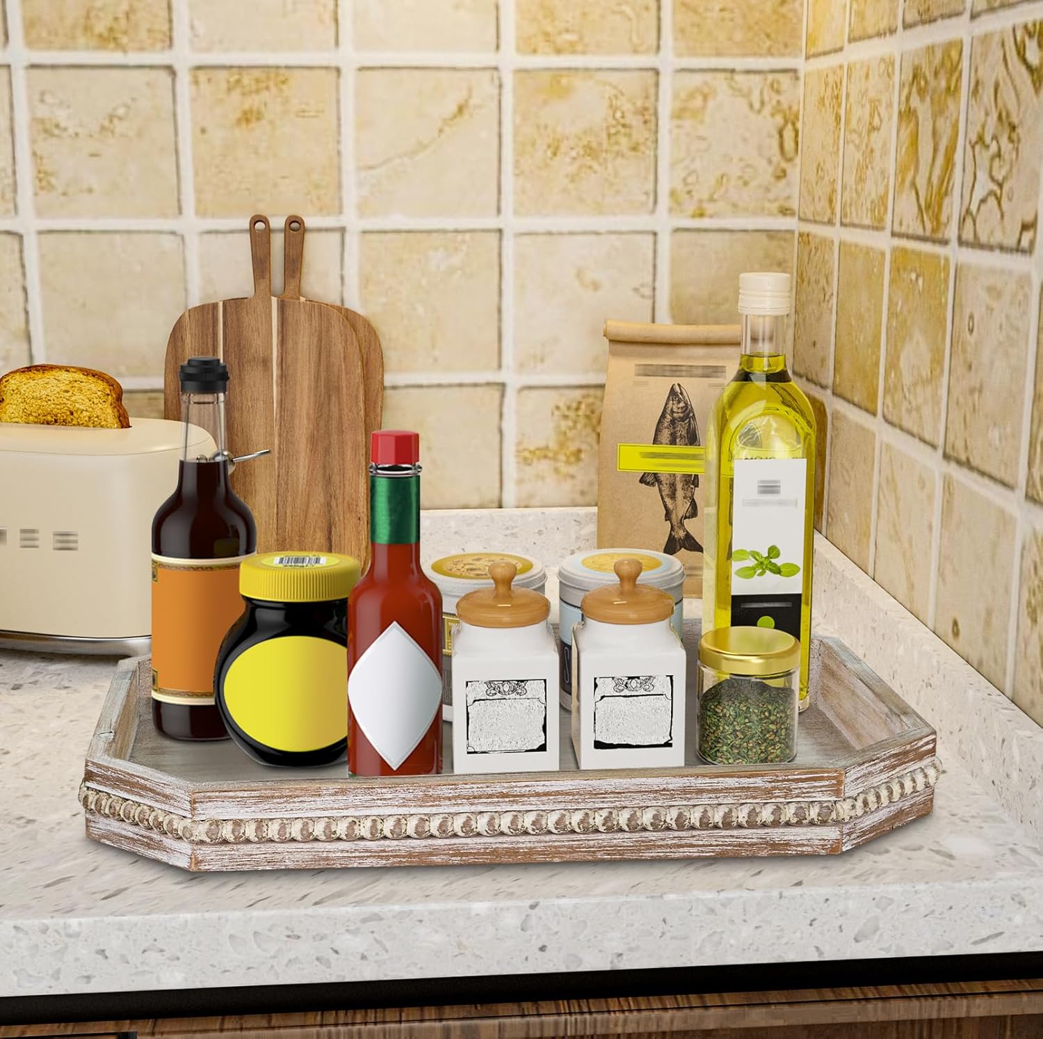 - REFINED AND ELEGANT: Octagonal serving tray is washed white finish and the edges are decorated with wooden beads, the distressed surface gives it a homey vintage feel. The overall appearance is unique and exquisite that goes well with many types of decor, create a fun centerpiece for your space.