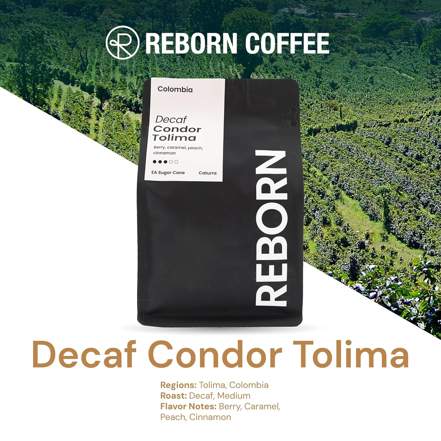 Reborn Coffee Specialty Whole Bean Decaf Coffee, Medium Roast, 12 Ounce, Colombia Condor Tolima, Flavor Notes of Berry, Caramel, Peach, and Cinnamon