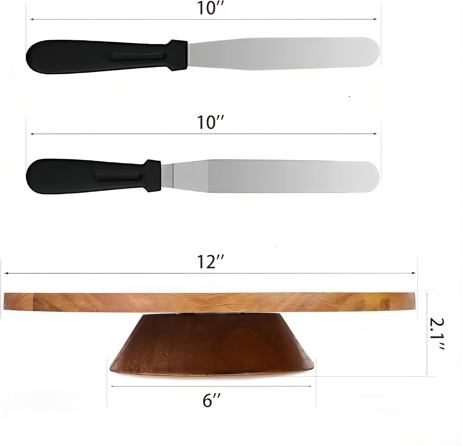 12" Acacia Wood Revolving Cake Stand, Rotating Cake Turntable with 2 Plastic Icing Spatulas, 3 Plastic Smoothers, Wooden Rotating Display Stand for Cake, Cupcake Decorating Supplies