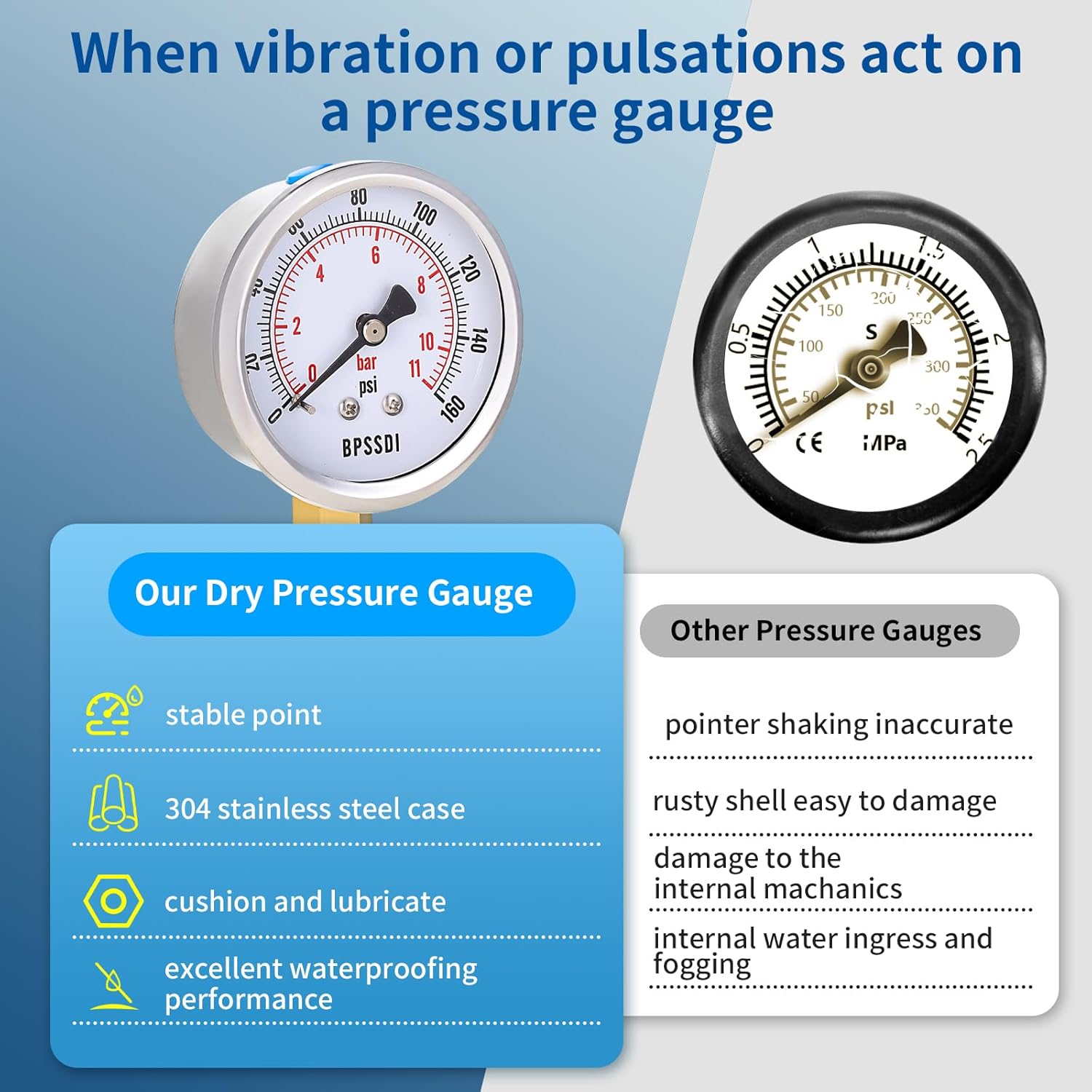 - Rugged and Stable - The pressure gauge is made of brass,304 stainless steel and food-grade silicone seals for higher stability and is used to measure the pressure of non-corrosive liquids and gases.