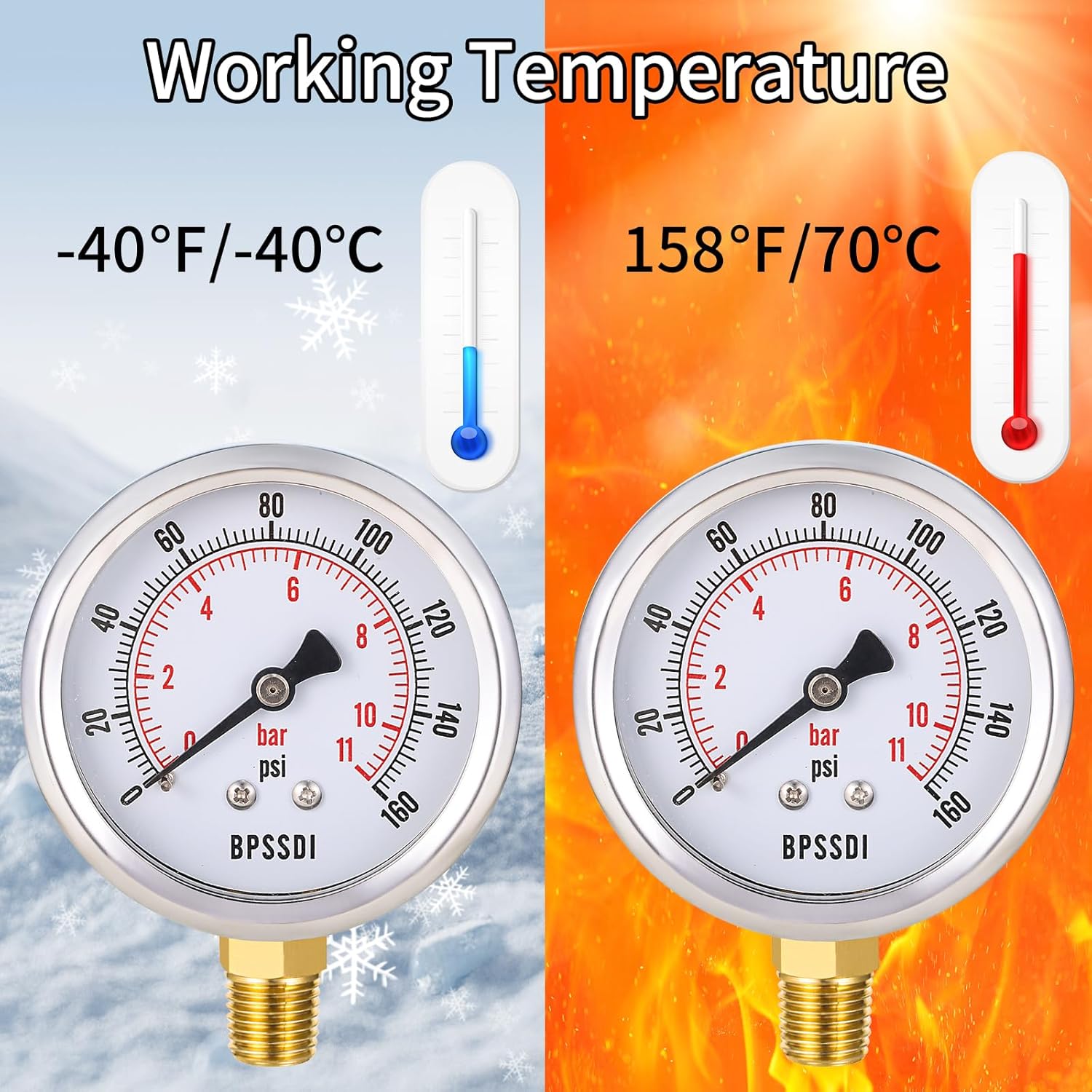 - Weather and Temperature Resistant - The pressure gauge can be used in environments from -40°C to 70°C in a variety of climates.