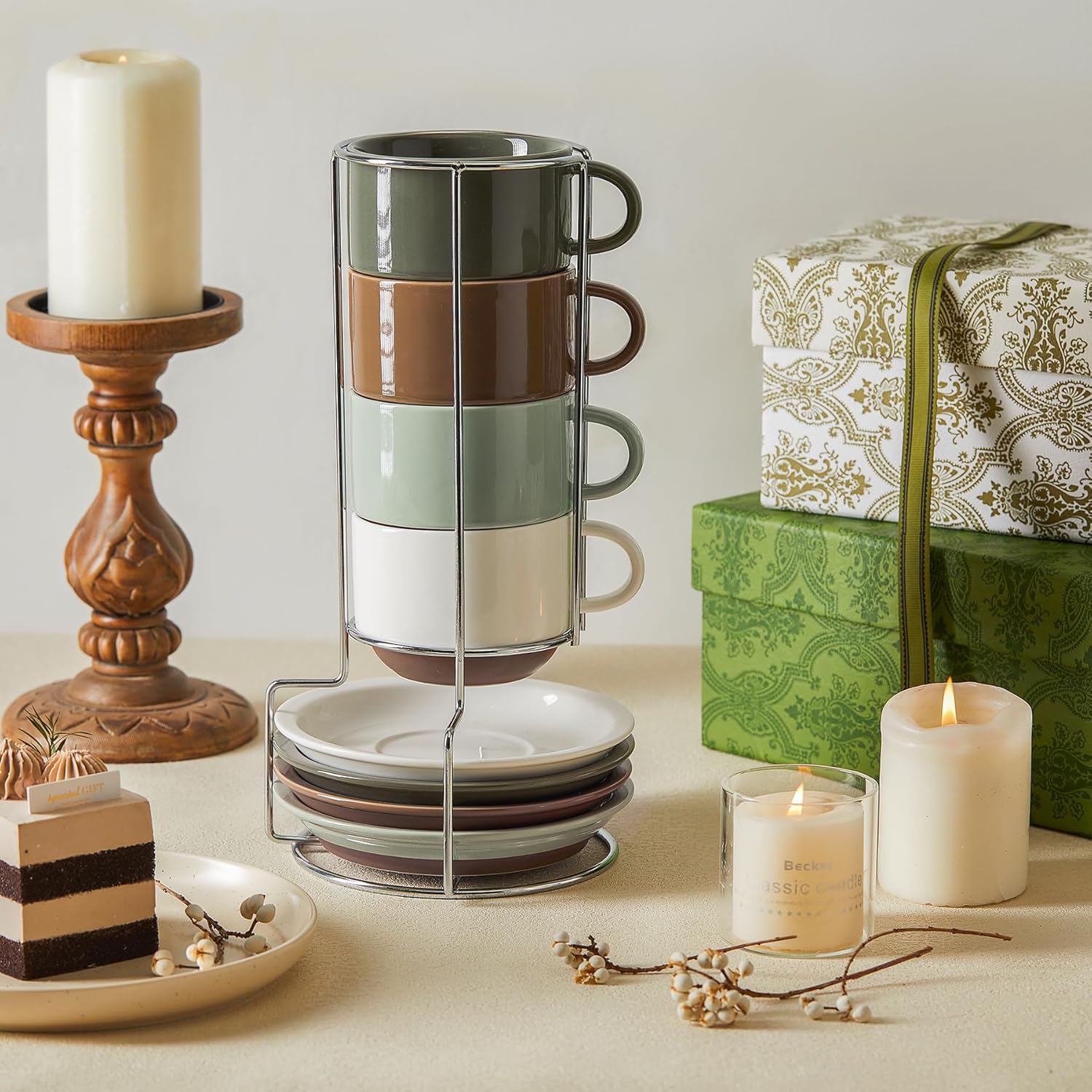 Sweese 8 Ounce Cappuccino Cups Set of 4, Porcelain Stackable Coffee Cups with Saucers and Metal Stand, Multicolor