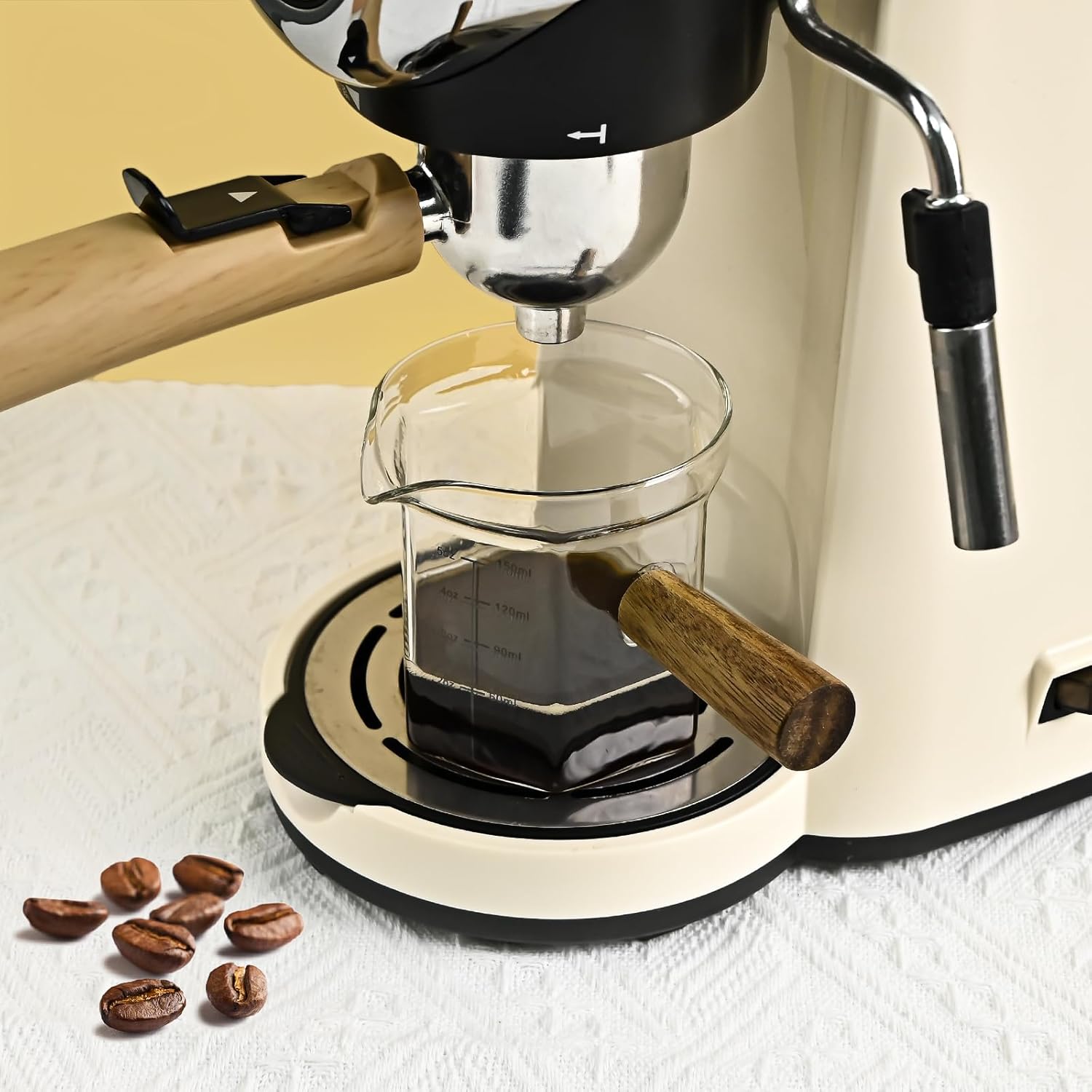 - Attractive Design: The espresso cup has a simple and exquisite appearance; with double spouts for easy pouring; a clear scale on the body of the cup to keep track of the amount of coffee you need; a wooden handle for a more comfortable grip