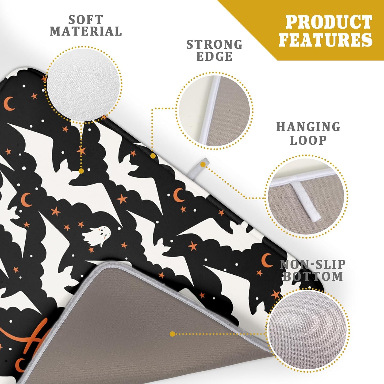 - 【Fashion Design】Our fall halloween kitchen mats are customized with single-sided printing, one side is takes halloween as theme, printed with happy halloween bats, cute ghost and little stars, does not easy to fade, perfect functional addition to your kitchen decor, fitting well and tightly on most counters. Prepare the best holiday gifts for family and friend, housewarming parties, weddings, birthdays, Halloween, Christmas and Thanksgiving.