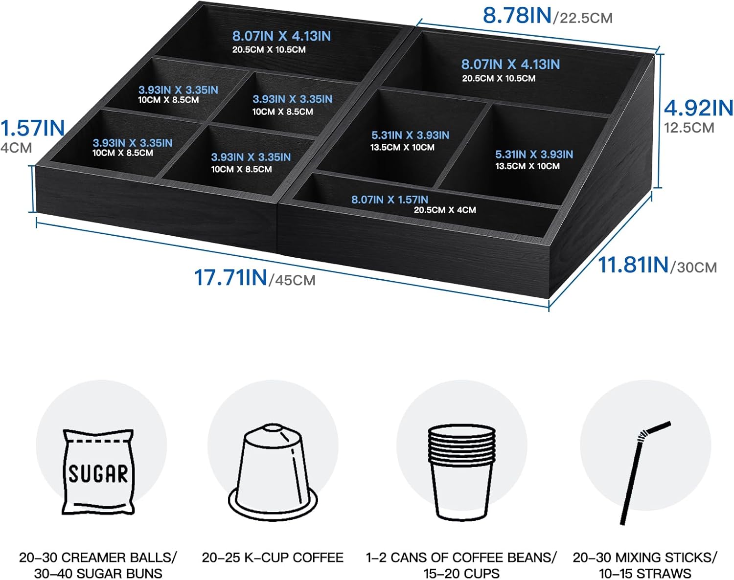 Coffee Station Organizer Coffee Condiment Service Tray with 9 Compartment for Counter, Wood Coffee Bar Supplies Organizer for Home Office Breakroom Two-in-One Black