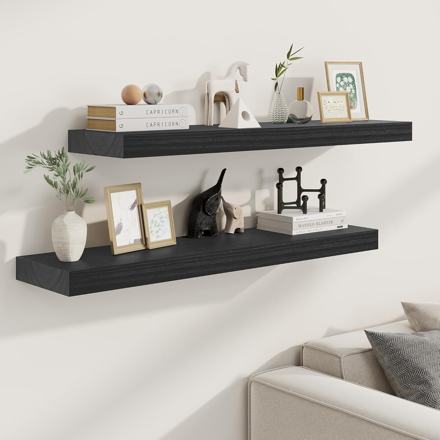 9.3 Inch Deep Floating Shelves, Black Solid Wood Floating Shelf Wall Mounted, 36 x 9 Large Display & Storage Shelves for Books, Living Room, Bathroom, Rustic Wooden Wall Shelves, Heavy-Duty, Set of 2