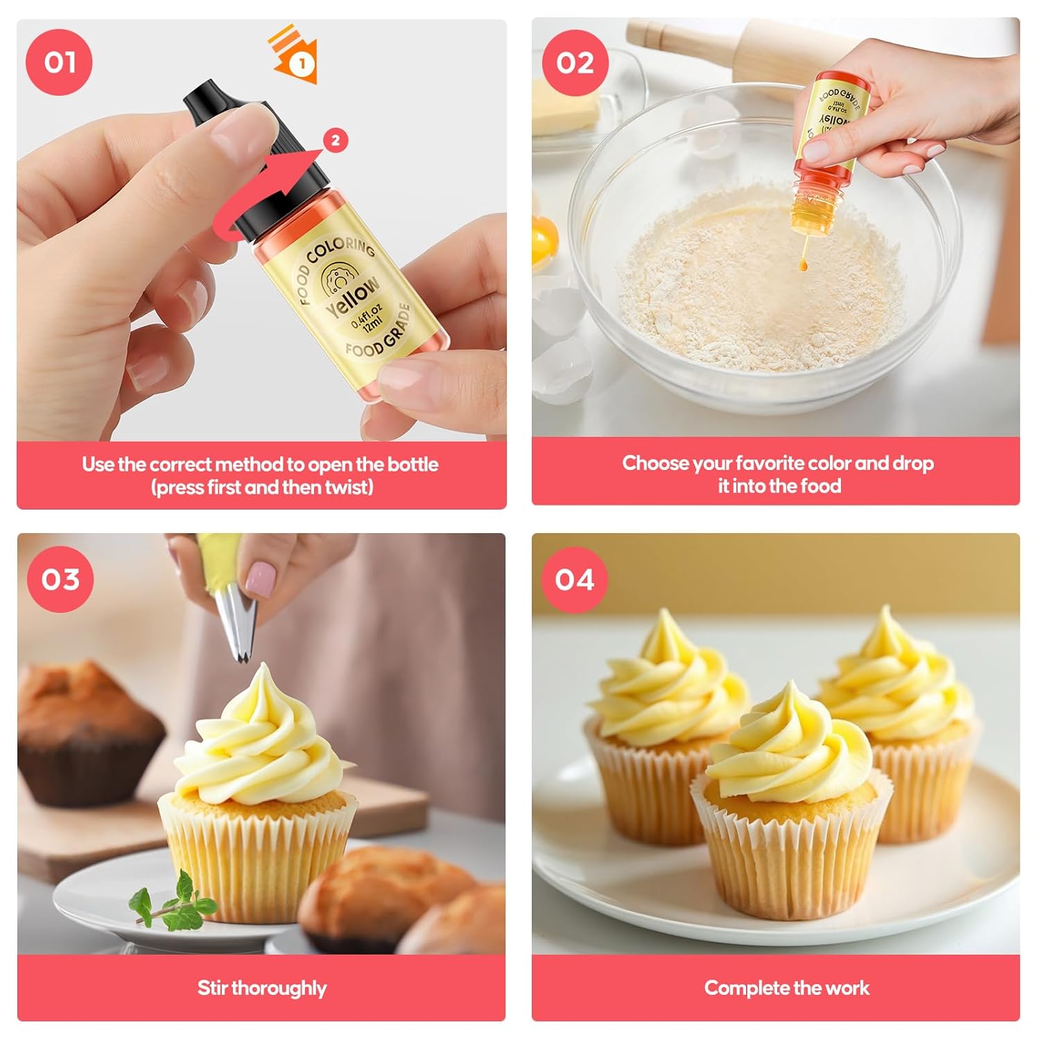 - Newest Baking Food Coloring Set - We have always been committed to developing rich colors and good experiences for our customers. As for the bottle itself, we have upgraded it to be the latest child-safe and friendly, so there is no need to worry about children eating it accidentally. For the correct usage, please refer to the order in the picture. We have also upgraded the squeeze bottles, which will make us better control without worrying about leakage during transportation