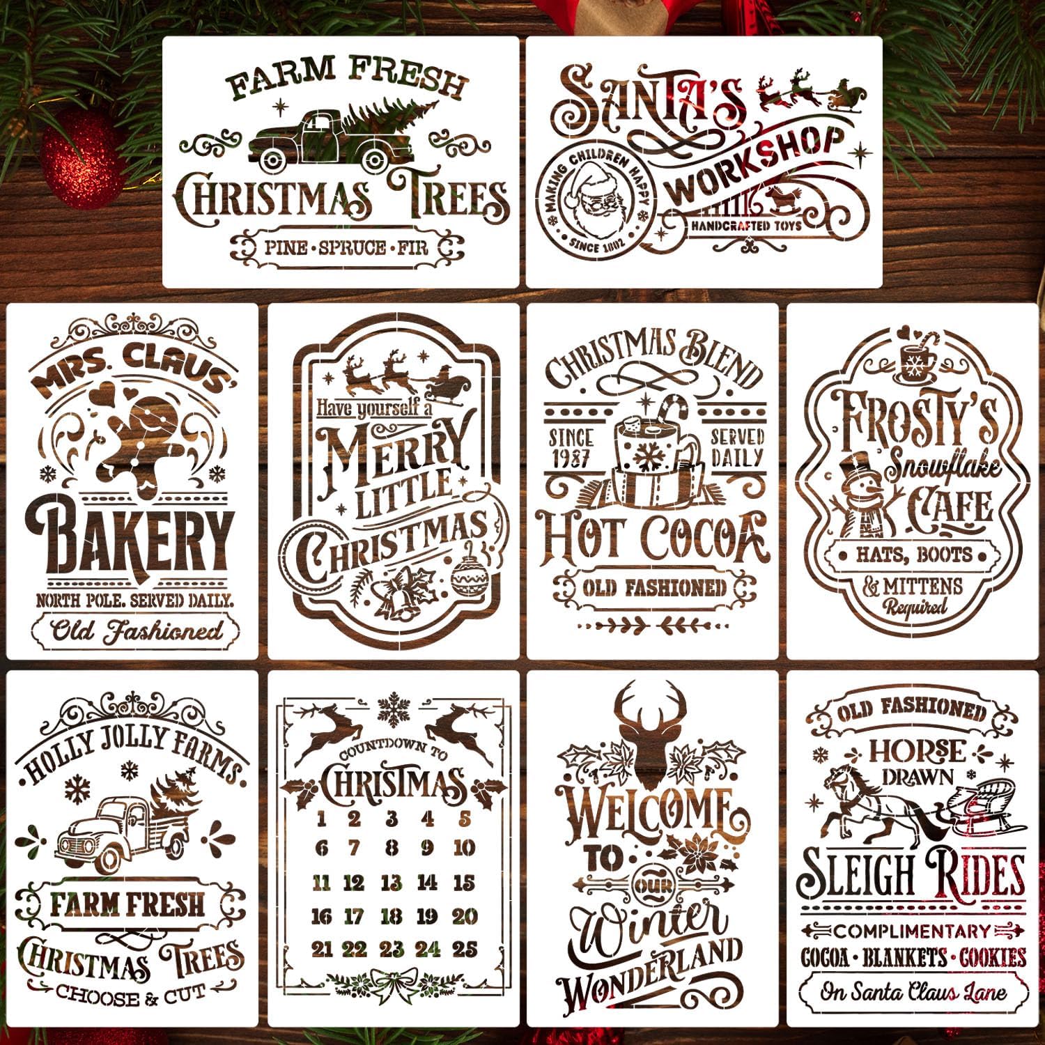 - Great for Xmas Decor:Easily add a seasonal accent to your home with these Christmas stencils for painting!Patterns includes farm fresh Christmas tree,hot cocoa,north pole bakery,frosty’s cafe,winter wonderland and sleigh rides.You can paint on a greeting card,round door hanger,door mat,wood sign.