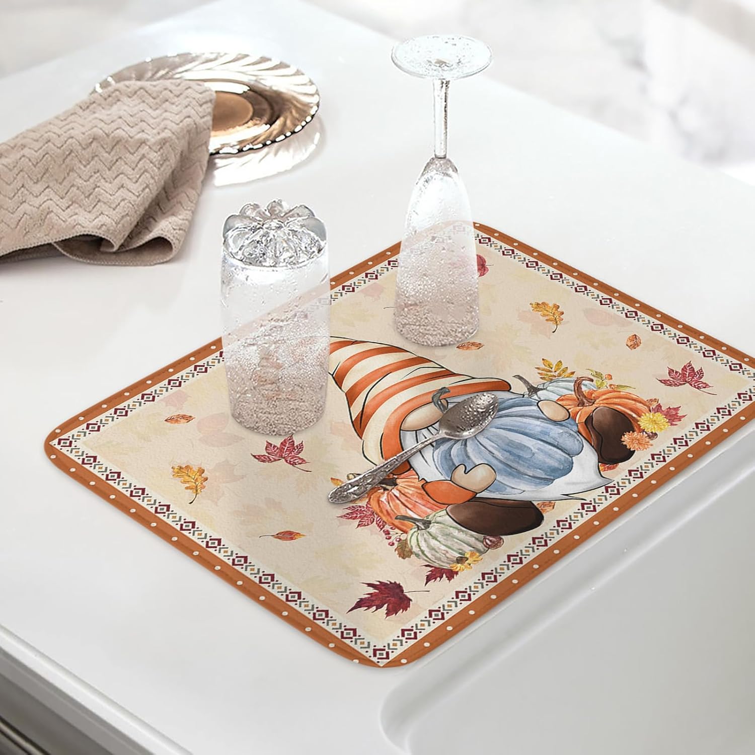 Fall Dish Drying Mat for Kitchen Counter Pumpkin Gnome Drying Pad Absorbent Drying Mats for Countertops Sinks Draining Racks Autumn Maple Leaves Drainer Holiday Harvest Thanksgiving Decorations 18x24