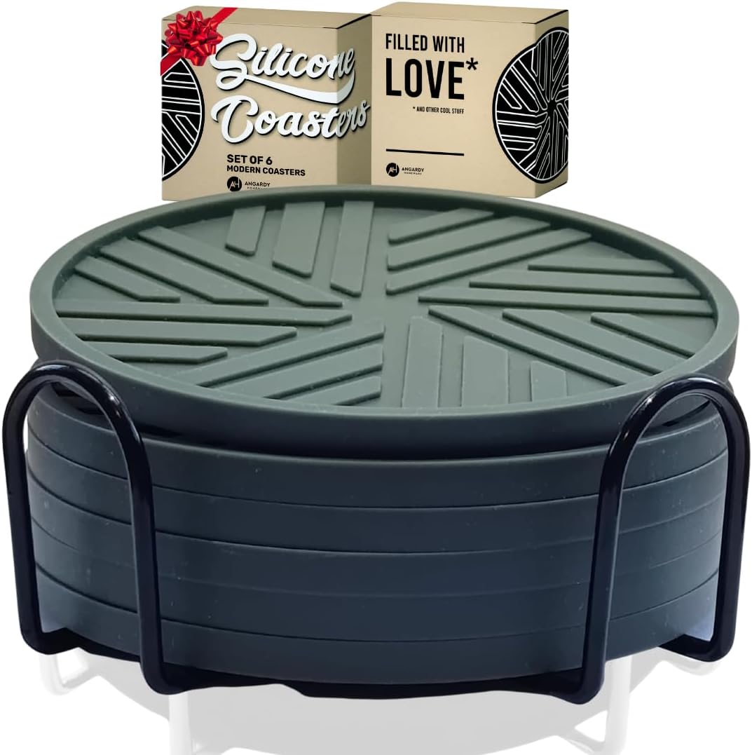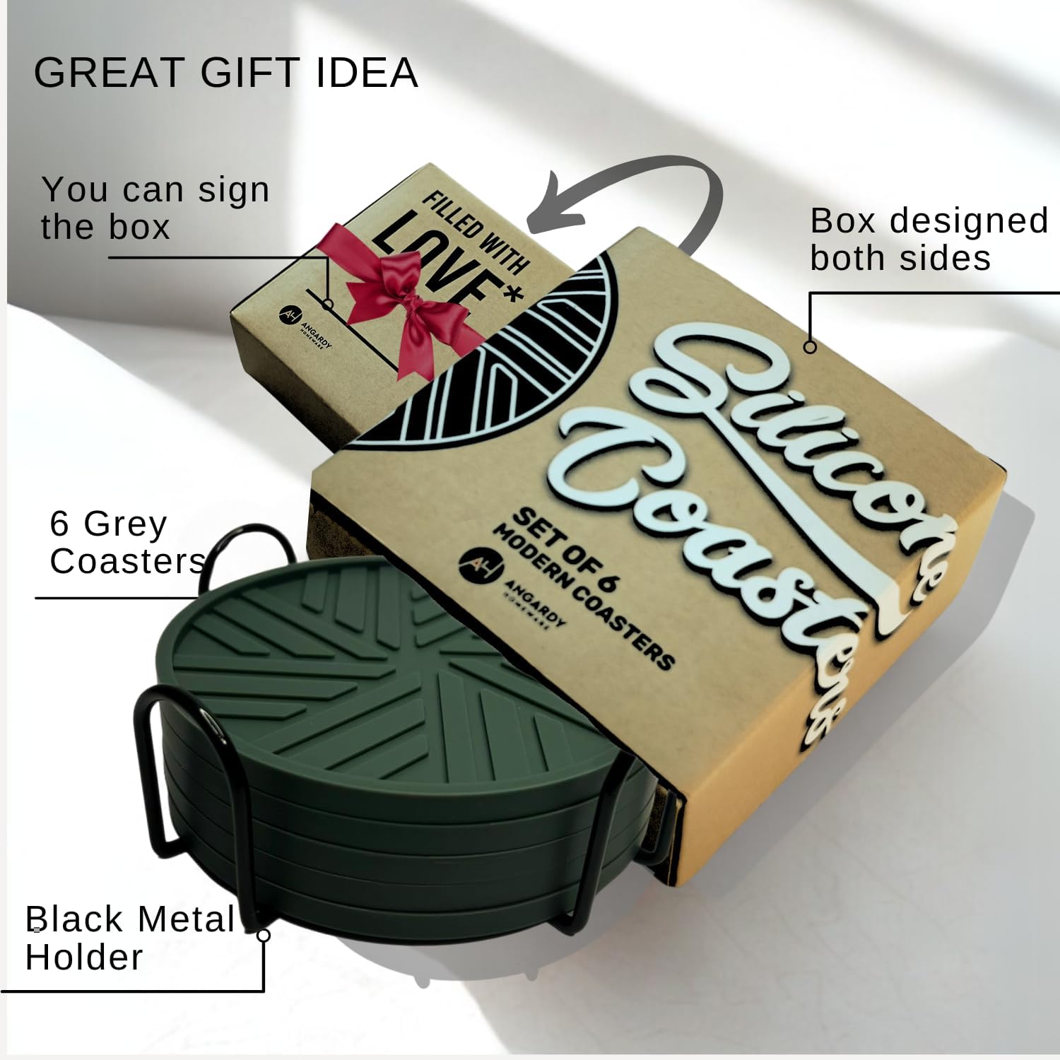 - Elegant Design and Organized Storage: This coaster set of 6 features Deep Grey silicone coasters with a modern geometric pattern and black holder, perfect for grey home decor and living room essentials.