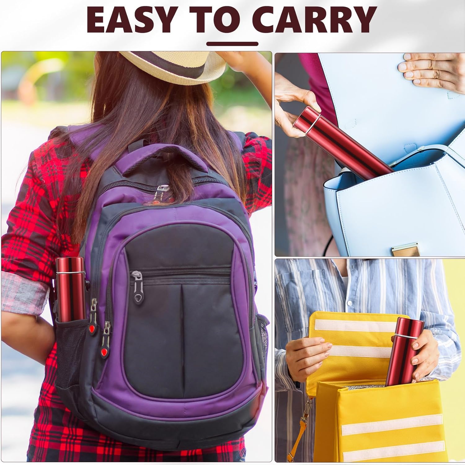- Slim and Easy to Carry: our slim water bottle for purse is thin and long, you can hold it with one hand; You can easily put it into your backpack, lunch bag, handbag, purse, tote bag's side pockets, travel purse, women's purse, fishing pack, gym bag, or suitcase, so you won't need to use a disposable cup or another person's cup; We remind you to carefully check if the lid is tightened before placing it in your backpack