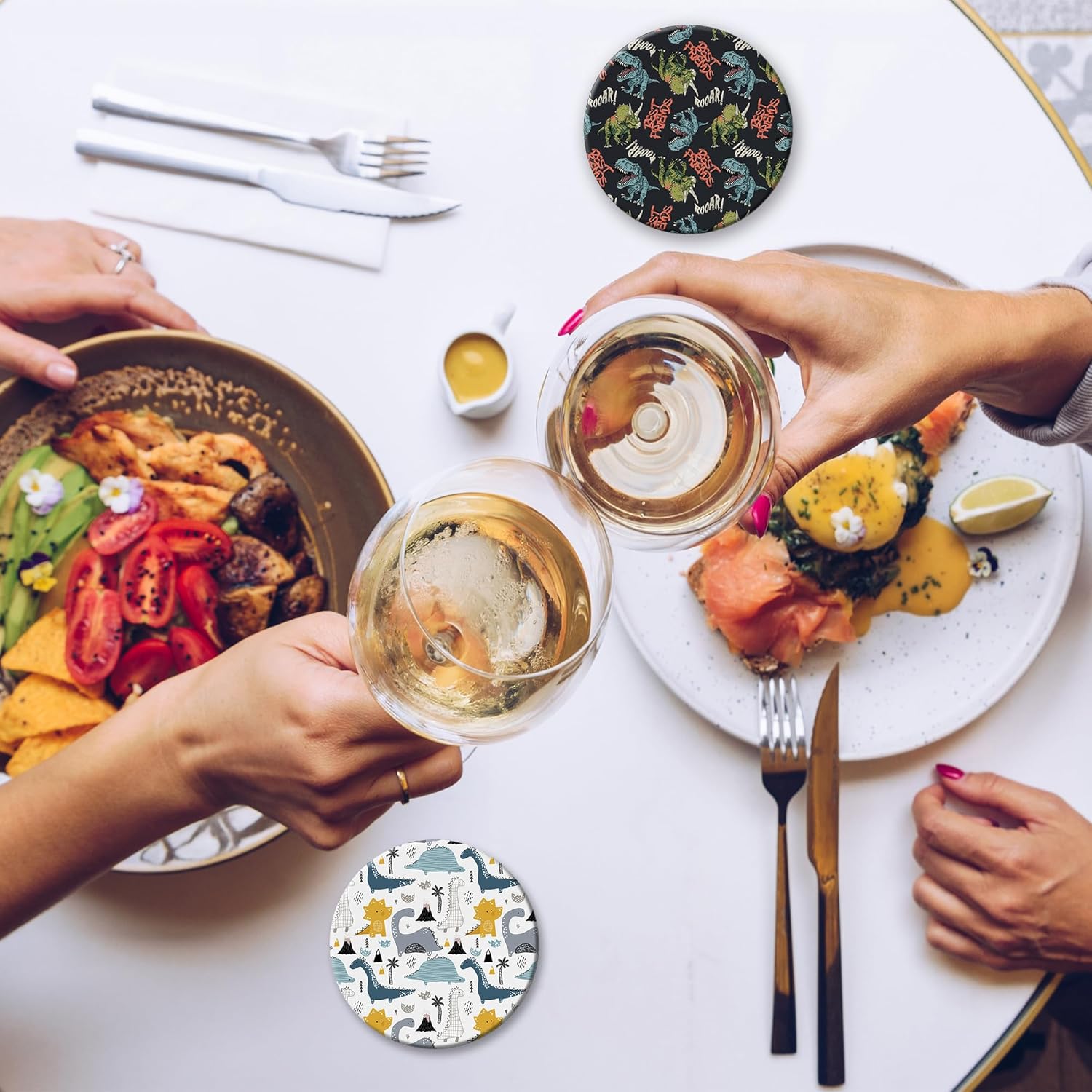 - Husiti Ceramic Coasters Set With Metal Holder: Keep Your Dining Table Stylish And Organized With This Set Of 6 4-Inch Round Coasters Featuring a Trendy Dinosaur Pattern.