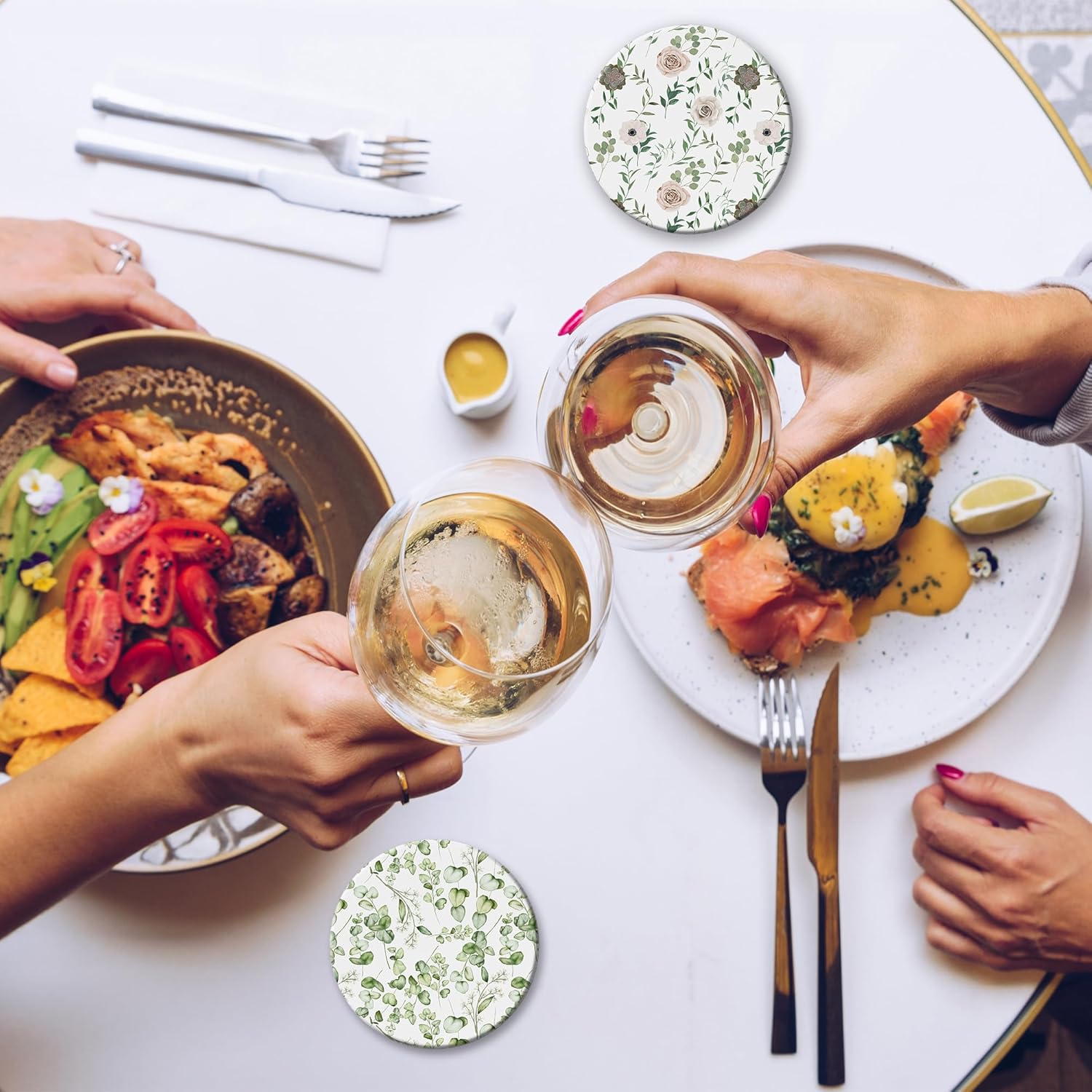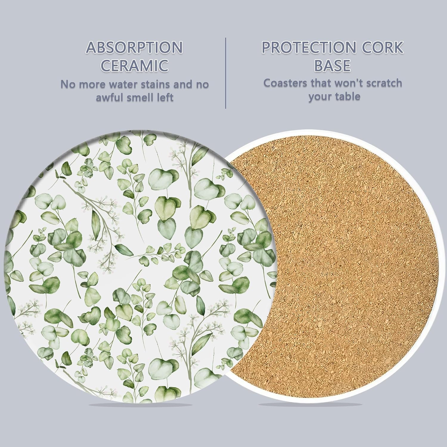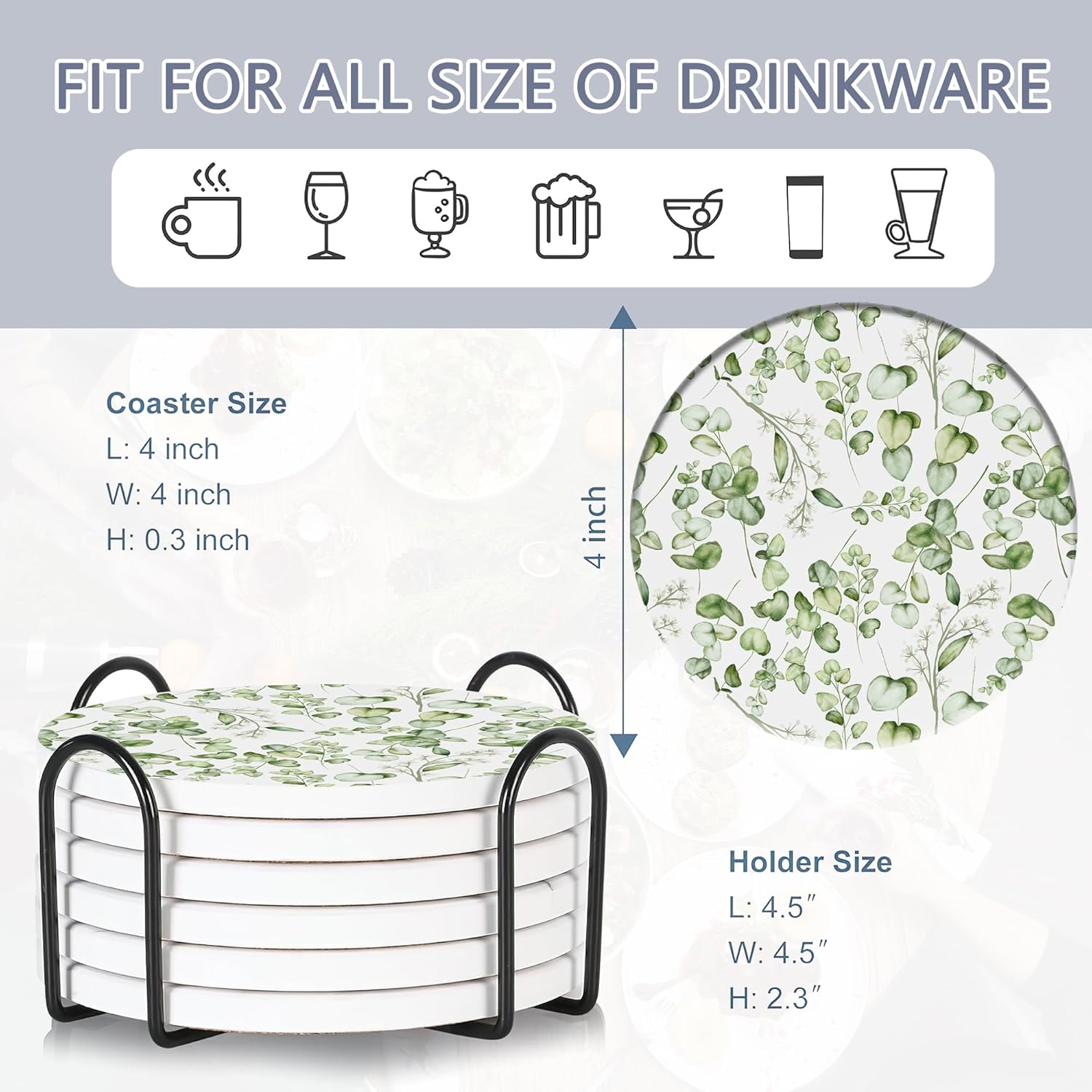 - Husiti Ceramic Coasters Set With Metal Holder: Keep Your Dining Table Stylish And Organized With This Set Of 6 4-Inch Round Coasters Featuring a Trendy Eucalyptus Leaf Flower Watercolor Pattern.