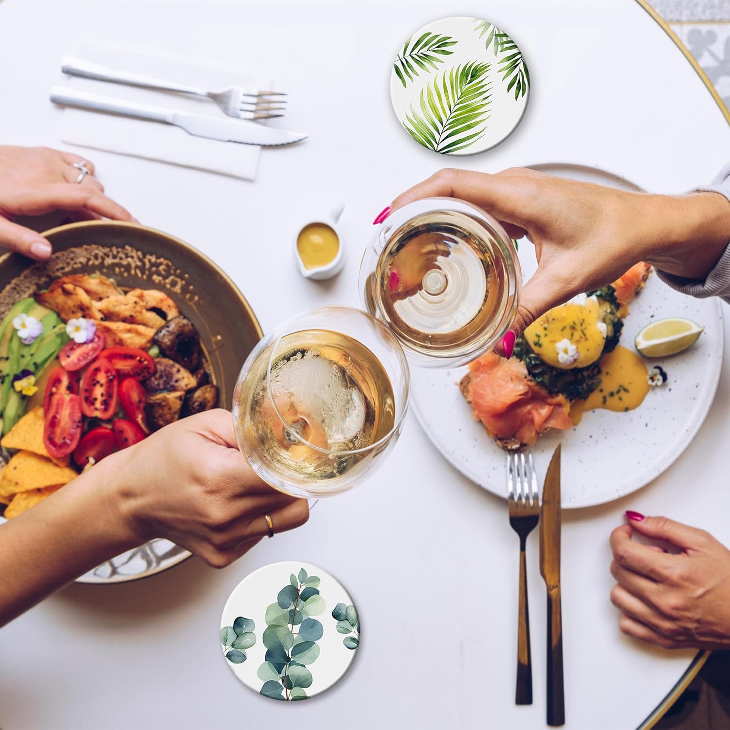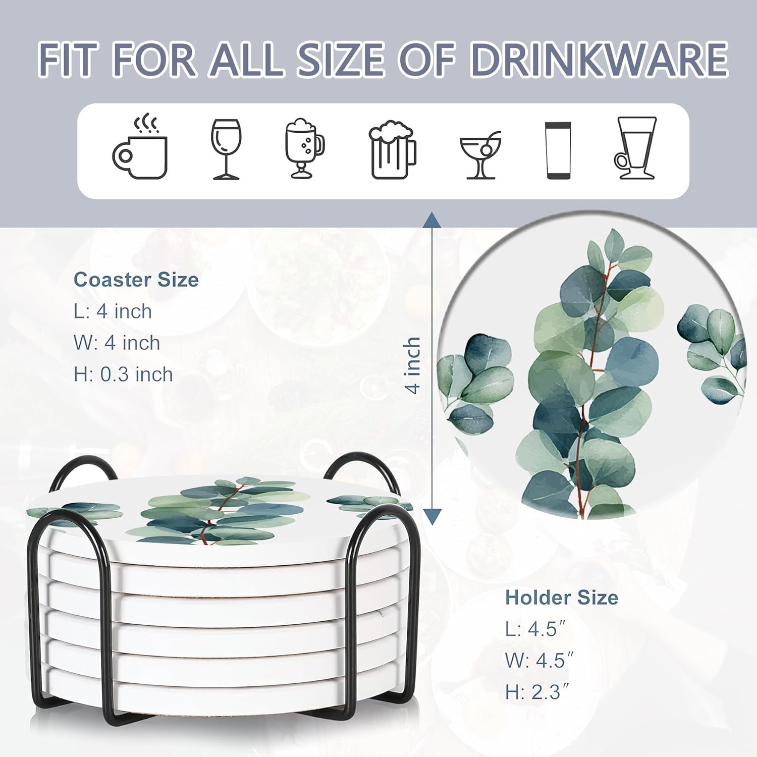 - Husiti Ceramic Coasters Set With Metal Holder: Keep Your Dining Table Stylish And Organized With This Set Of 6 4-Inch Round Coasters Featuring a Trendy Green Leaves Pattern.