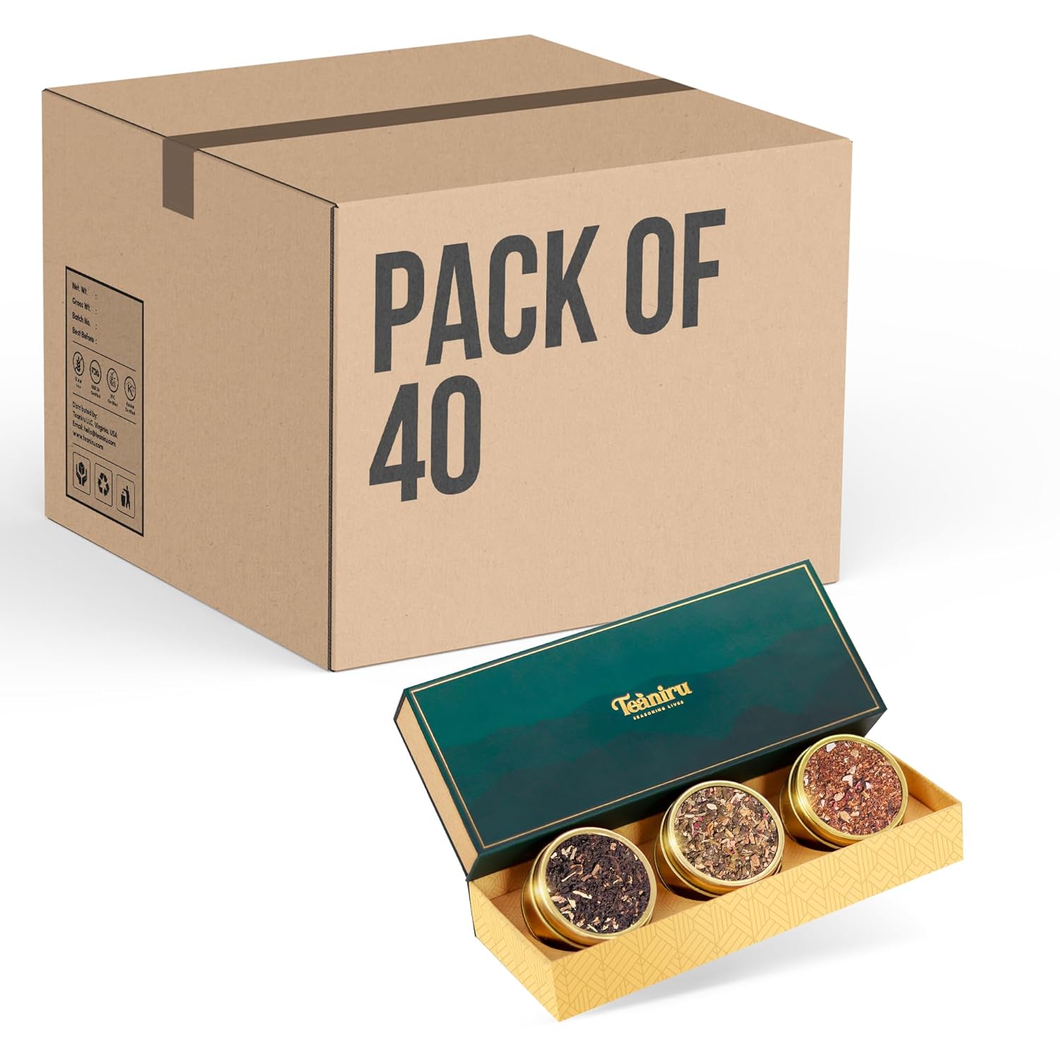 Teaniru, Grandeur Tea Collection – Pack of 40 | Loose Leaf Tea Sampler Gift | 3 Flavored Tea - Black, Herbal & Green Tea | Loose Leaf Tea Gift Set for Corporate Gifting