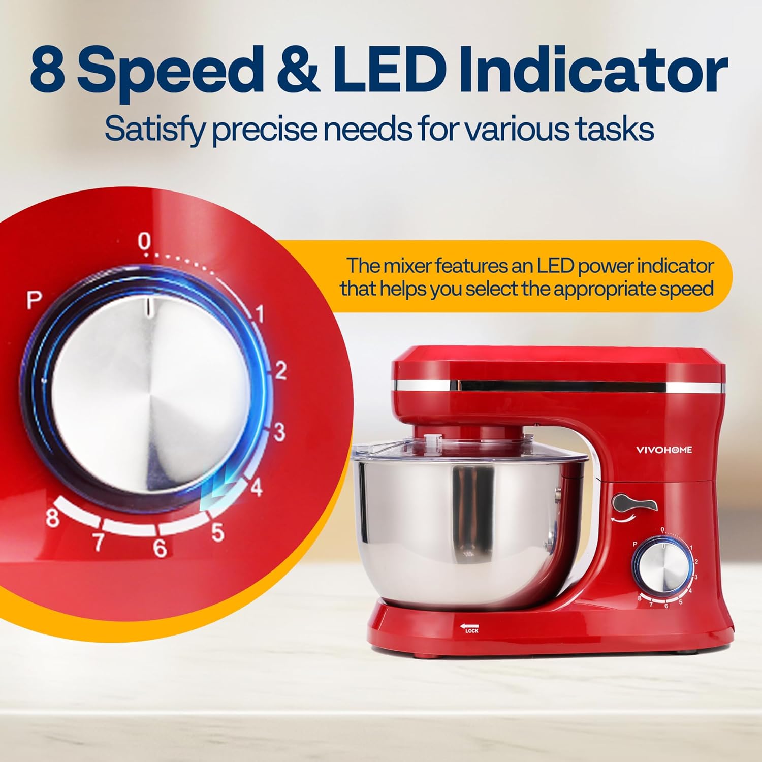 - 8 SPEED SETTINGS & LED INDICATOR: Handy 8-speed control meets the precise needs of various mixing tasks; Whether you’re mixing fine flour, thick dough, or eggs, you’ll find the right speed; The pulse function delivers powerful bursts for better control, ideal for breaking down large chunks and preventing overmixing; The mixer includes an LED power indicator to help you select the correct speed; Suction cups on the base keep the kitchen mixer securely in place