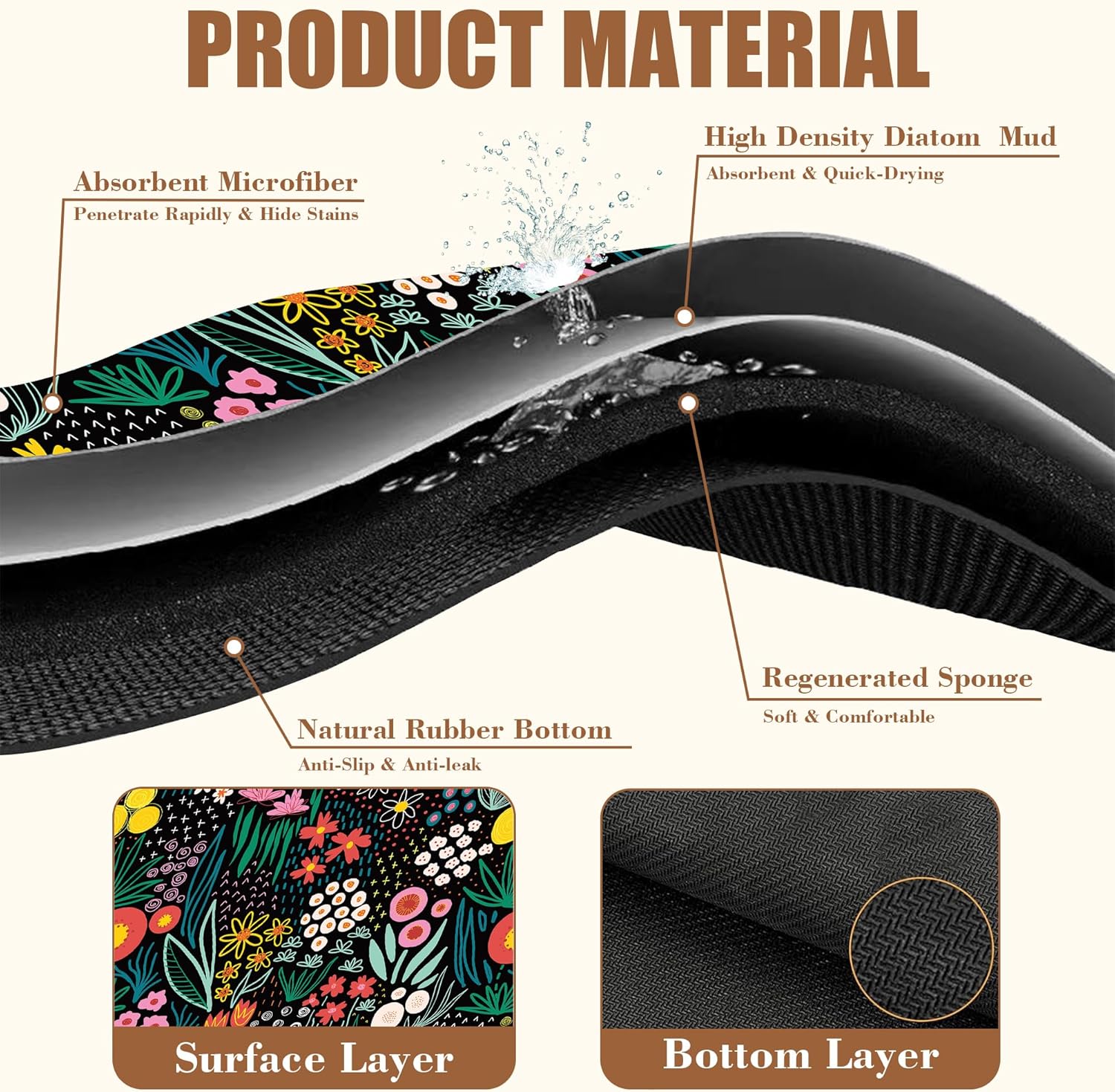 Dish Drying Mat Doodle Flower Meadow Coffee Bar Mat for Countertop Absorbent Rubber Backed Hide Stain Dish Drainer Rack Pad Coffee Pot Espresso Machine Dining Room Decoration 11.8 x 19.7 Inch