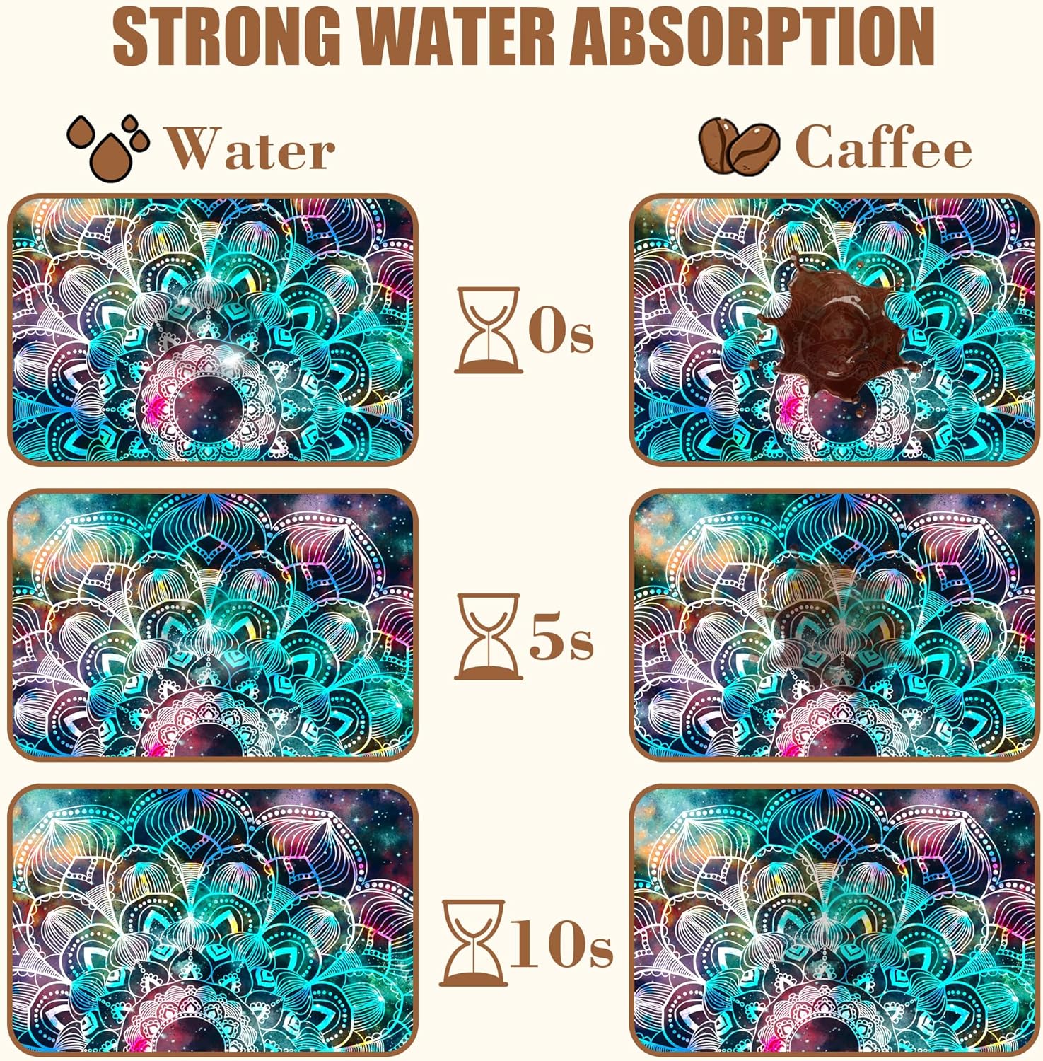 - 【Absorbent & Quick-Drying】The surface of this coffee mat is made of absorbent microfiber and the middle is made of composite sponge, which can absorb up to 4 times its weight in water and has a strong water absorption capacity. The high-density design makes it fast drying and can quickly absorb spilled liquids to keep your counter or desktop dry