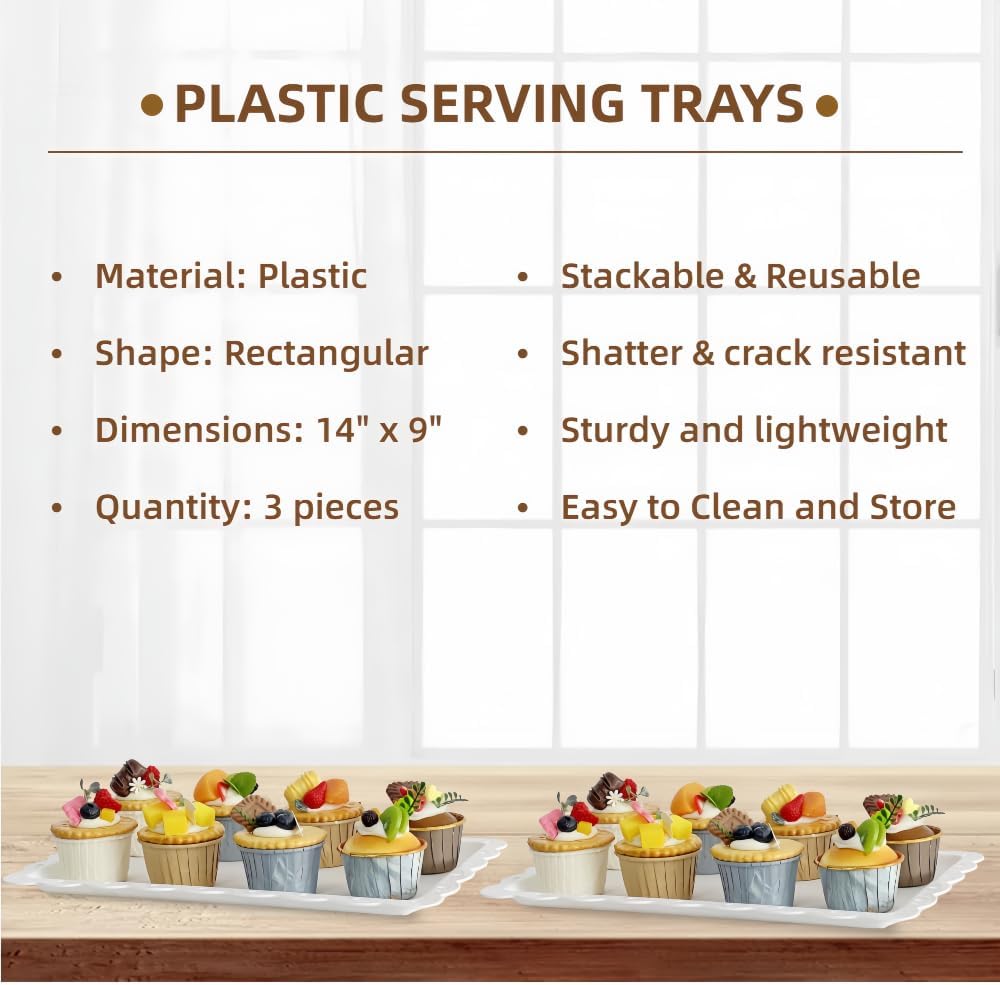 - You will get: 2 packs large three tiered trays contain 1 square & 1 round. Square stand can hold 12 pcs cupcakes, round stand can hold 18 pcs cupcakes. 3 packs of rectangle plastic serving tray which are enough for your food display and storage