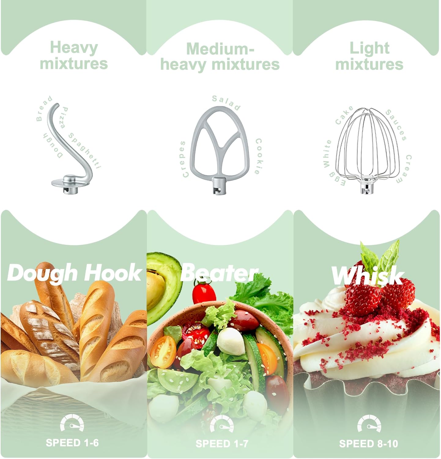 - Upgraded Accessories and Dishwasher Safe- Aluminium dough hook and flat beater with protection layer,stainless steel whisk are all easy to attach,more sturdy and durable. All of the attachments for the food mixer are dishwasher-safe for quick and easy cleaning.