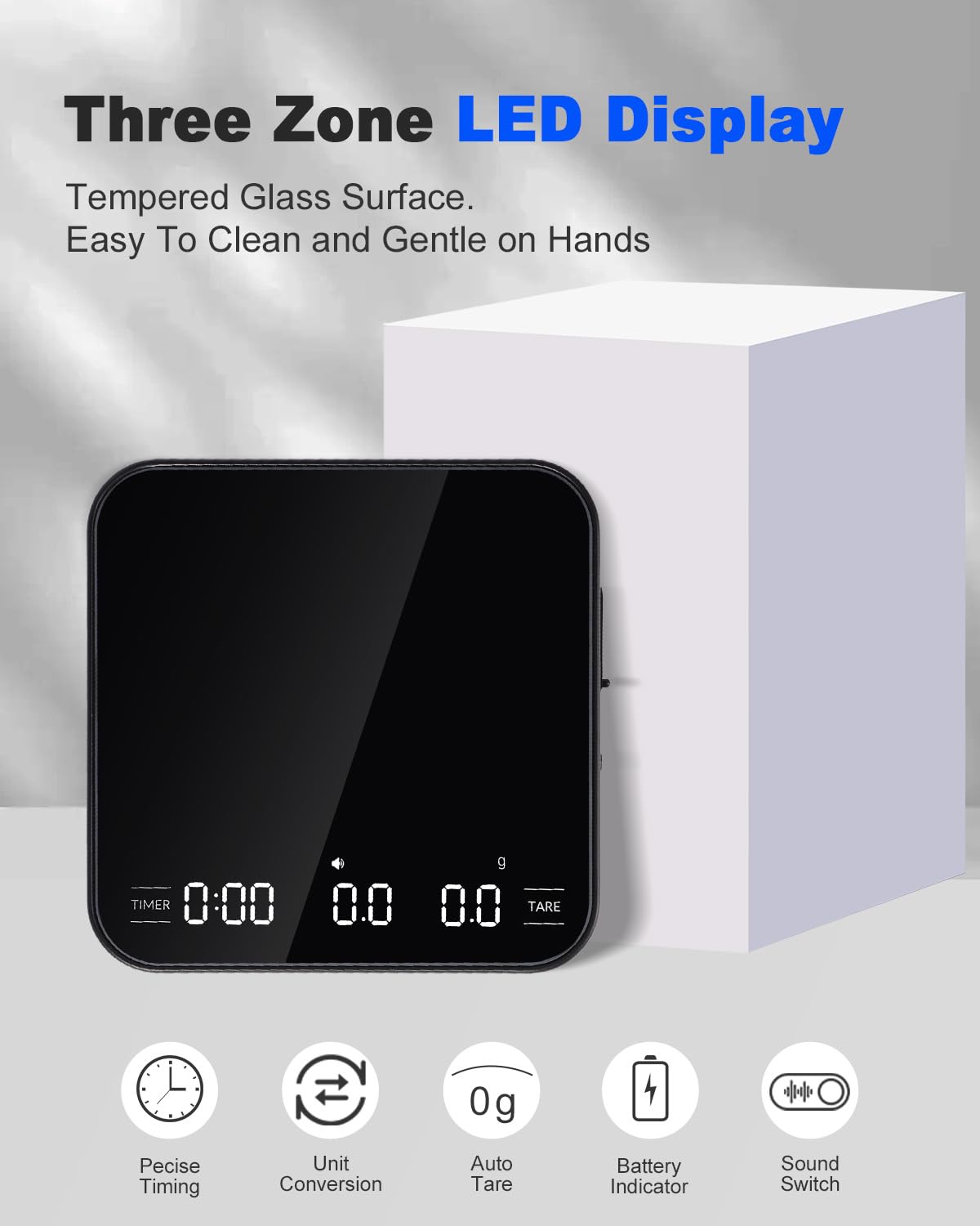 - Mini Size, Yet Professional: This digital espresso scale is measured of 4.13*4.13*0.78 inches, weighs 0.6 pounds. Thanks to its compact design, it can fit into most coffee machines and pour-over coffee makers. Its volume is equivalent to a mobile phone, you can take it away at will, and even put it in your pocket, making it the perfect choice for travel. Newly upgraded three zone display, the added powder to water ratio display area makes you professional like a barista