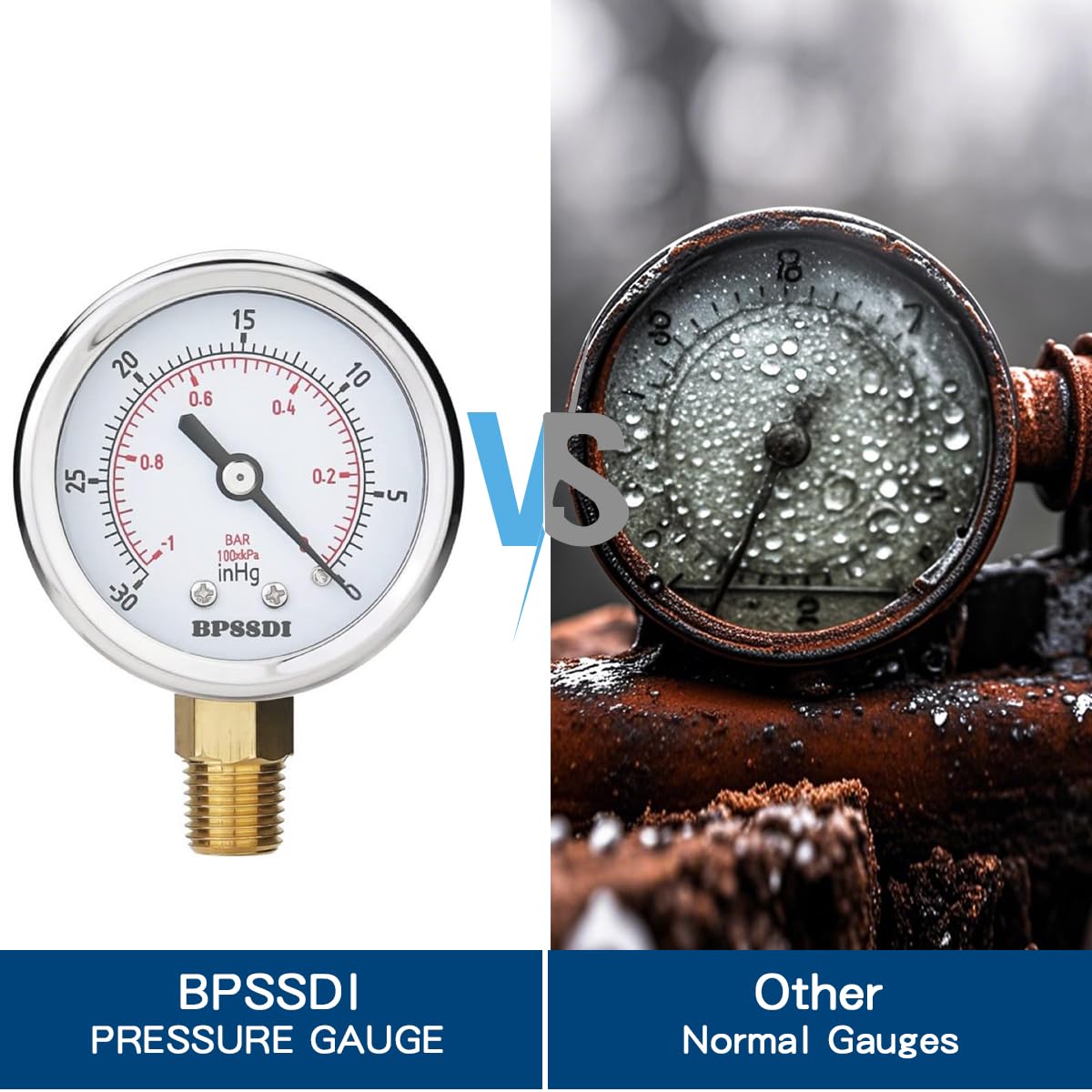 30inHg Vacuum Pressure Gauge, Water Pressure Gauge, 2.5" Dial Size, 1/4" NPT Lower Mount, 304 Stainless Steel Case, for Pneumatic Air Compressor RV Regulator Valve Test(with Tape)