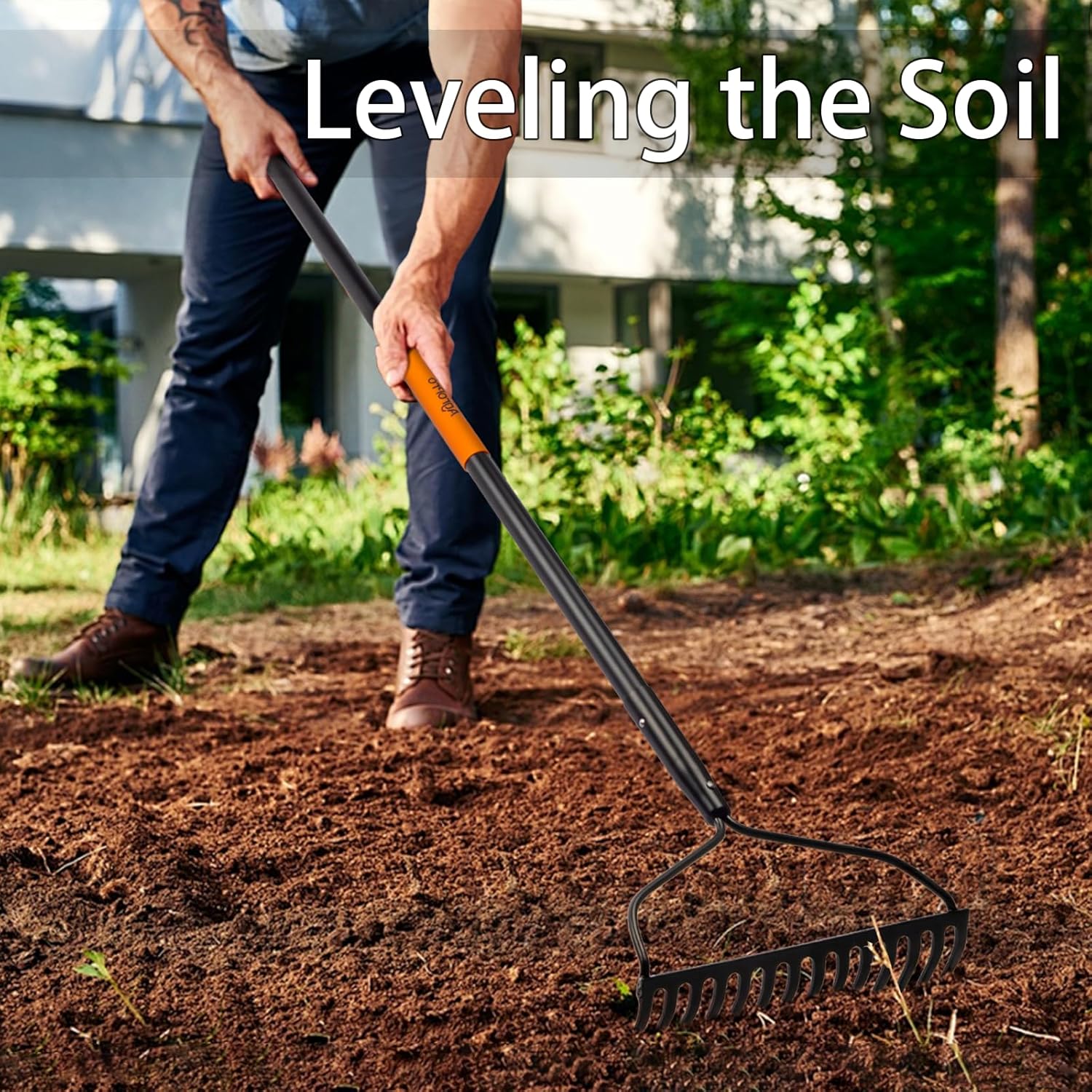 - Wide Applicability: AgroPro metal rake is suitable for a wide range of gardening scenarios. In the garden, the heavy duty rake can not only be used to loosen the soil for fertilizing, spreading mulch and assisting in planting, but can also be used to collect fallen leaves in the yard as well as rake away dead grass from the lawn.