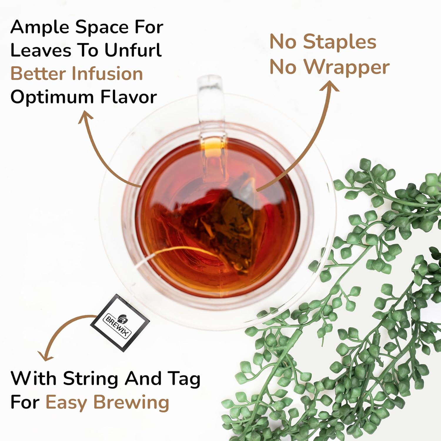 - CONVENIENTLY PACKED - The tea comes packed in pyramid bags that allow for a more fuller and intense brew as it provides ample space for the tea leaves to unfurl and infuse. We have removed individual sachets from our packaging to reduce wastage, instead the pyramid bags are packed inside a resealable pouch that can be conveniently stored or carried as a travel tea. Each pyramid black tea bag / earl grey tea bags contains 2gms of tea. Tea for one.