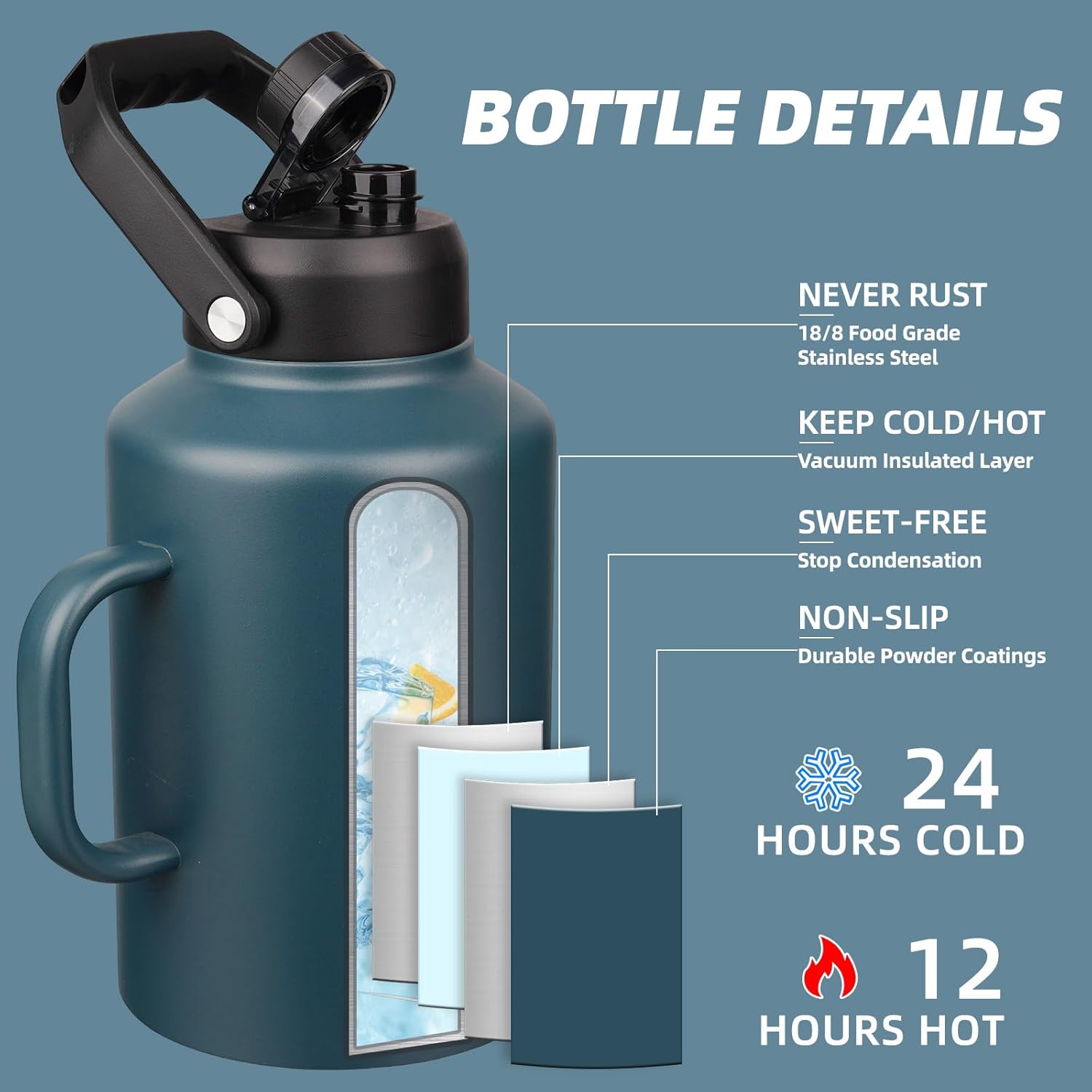 - INSULATED WATER BOTTLE: BJPKPK gallon water bottle use double-walled vacuum insulation technology to keep your beverage cold for up to 24 hours, or hot for up to 12 hours, make sure you enjoy your favorite beverages at the most suitable temperature all day.