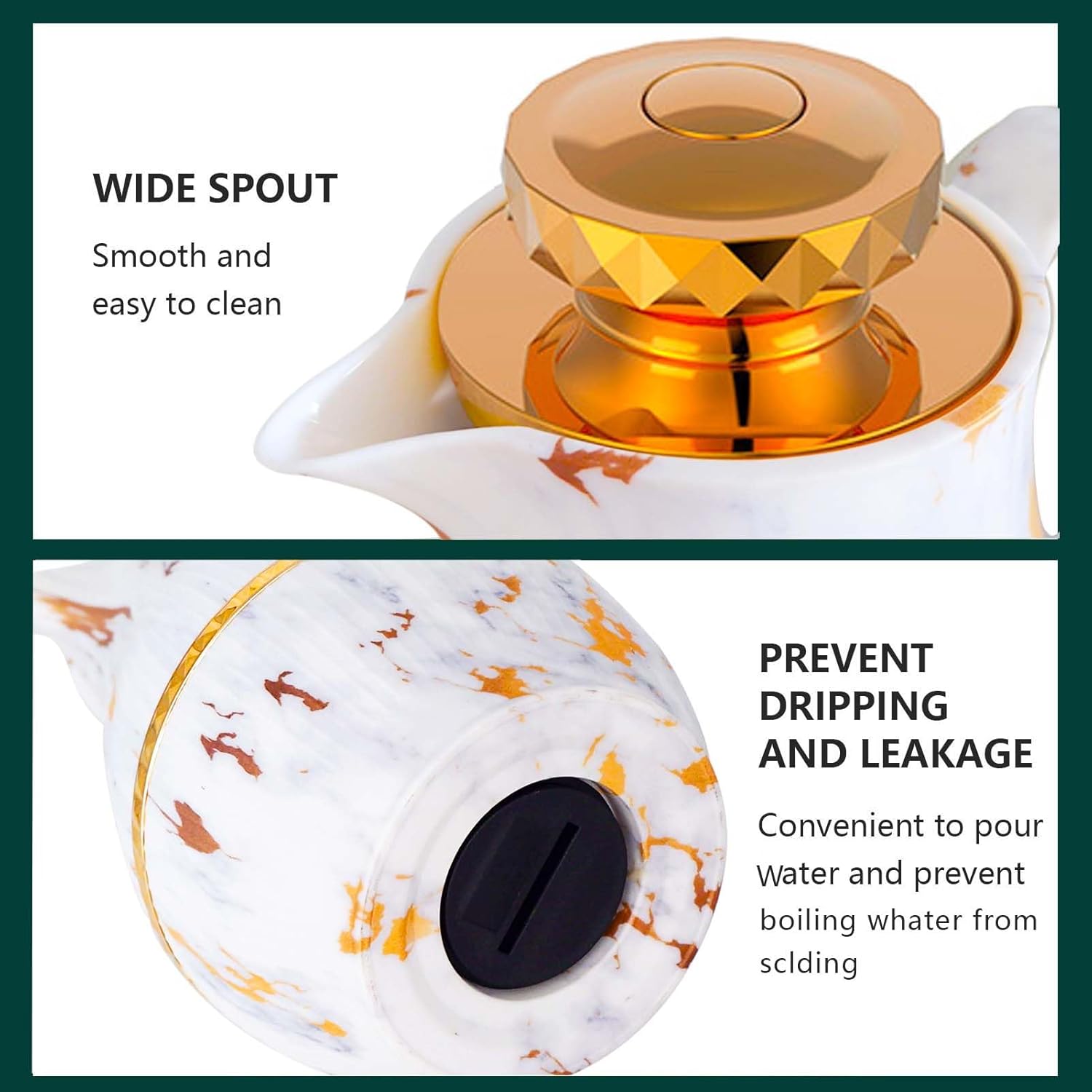 Insulated Thermal Coffee Carafe, 33 oz, Luxury Arabic-Style Insulated Carafe Flask, Coffee Tea Pot, with Spout and Glass Liner for Hot Cold Water, Housewarming Ornaments (White and Gold)