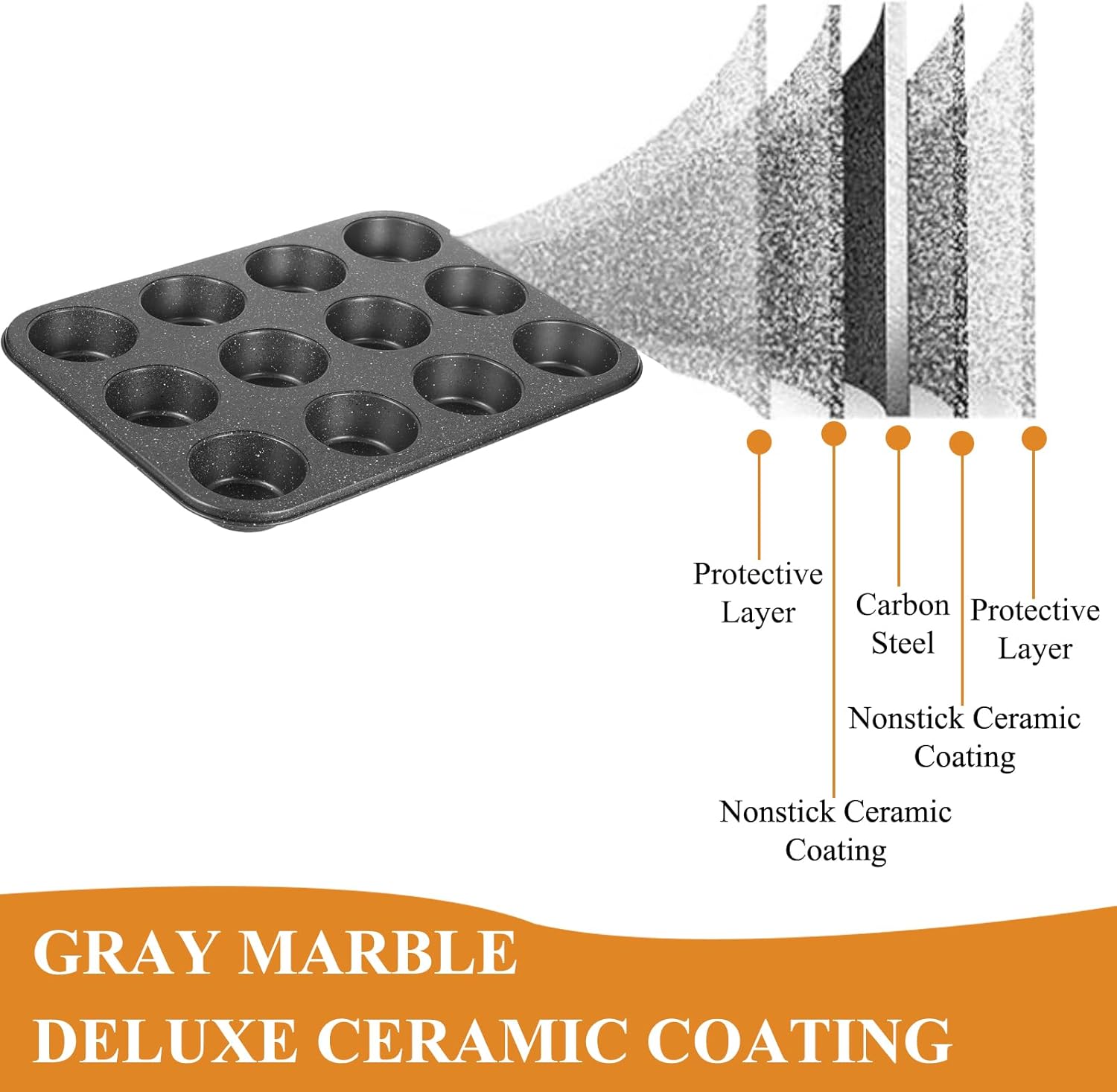 - 【PREMIUM QUALITY】This muffin pan nonstick is made of high quality carbon steel material with gray marble deluxe ceramic coating. Its rich black and white accent flecks make this bakeware both high fashion and high function.