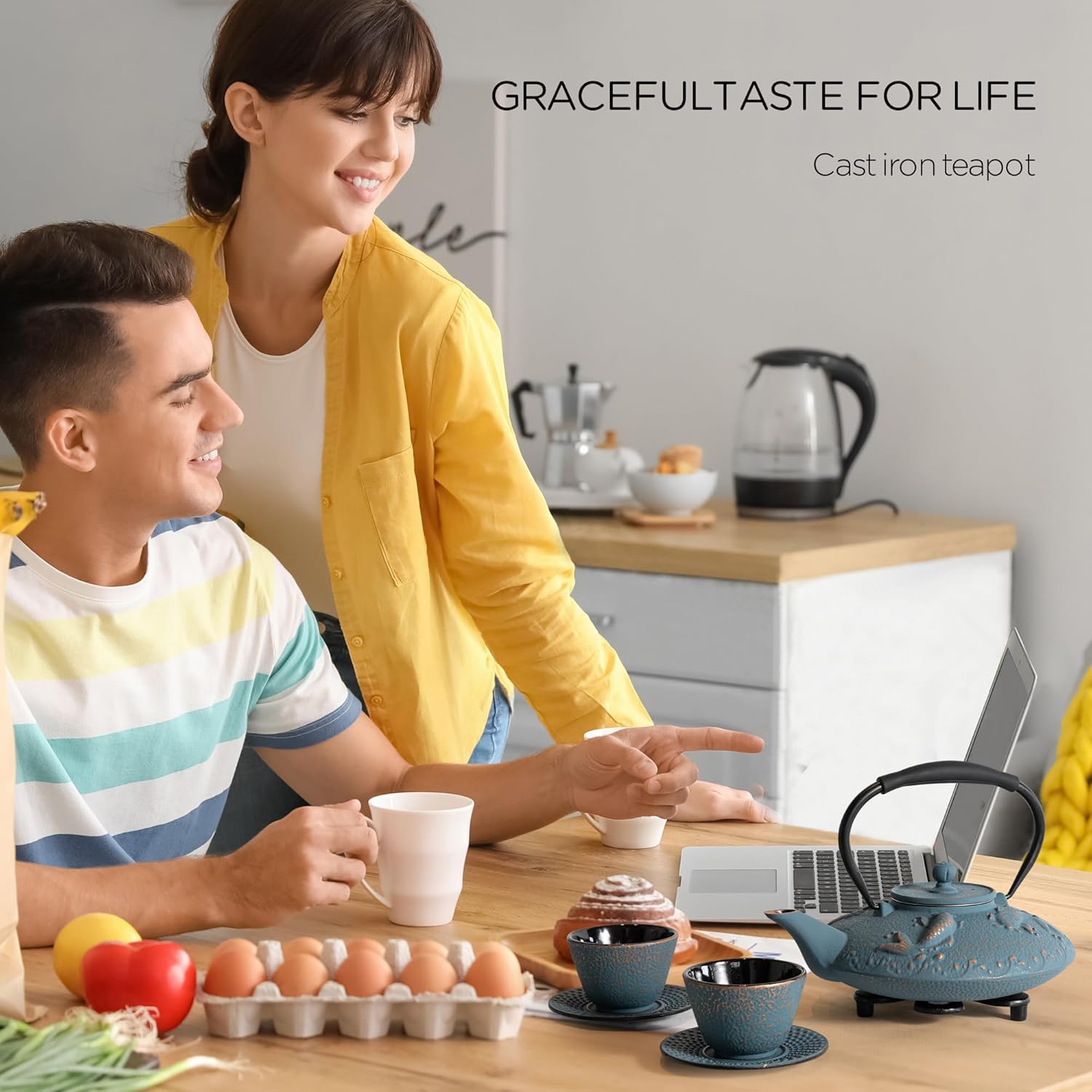 Cast Iron Teapot Set with 2 Tea Cups, 7Pcs Japanese Tea Kettle with Stainless Steel Infuser, Tea Pot Coated with Enameled Interior, Fish Pattern, 27oz 780ml Navy Blue