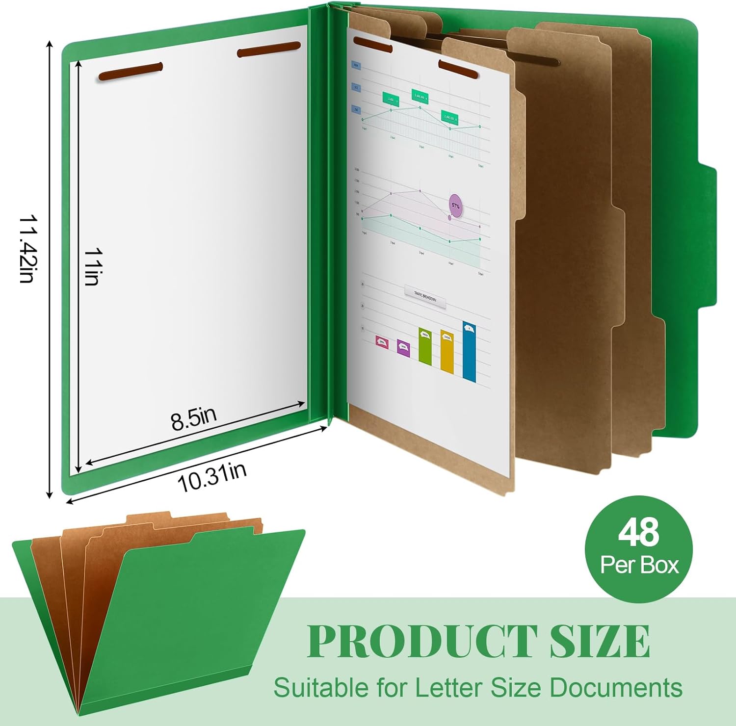 48 Pcs Classification Folders Letter Size, Back to School Supply for Teacher, Student, 3 Dividers Pressboard File Folder Bulk with 2 Fasteners, 3.5 Inch Expanding File Organizer (Green)