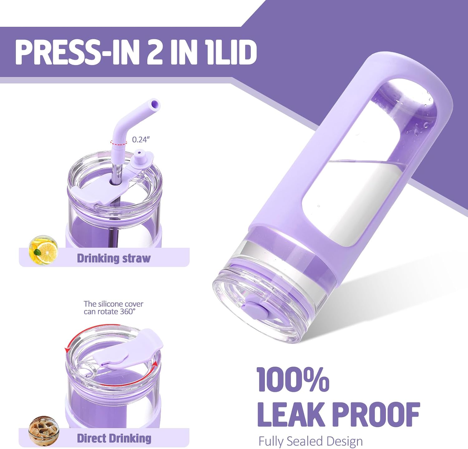 - NATURAL &SUSTAINABLE MATERIALS-Kodrine glass tumbler with lid and straw features with 2 lids-BAMBOO LID and ON-THE-GO LID, also comes with 2 reusable straws + bonus straw cleaner. Food-grade silicone sleeve & non-slip base (BPA-free),High borosilicate glass(odor/taste resistant)