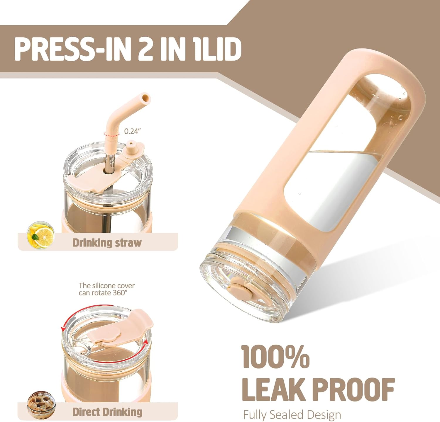 - NATURAL &SUSTAINABLE MATERIALS-Kodrine glass tumbler with lid and straw features with 2 lids-BAMBOO LID and ON-THE-GO LID, also comes with 2 reusable straws + bonus straw cleaner. Food-grade silicone sleeve & non-slip base (BPA-free),High borosilicate glass(odor/taste resistant)