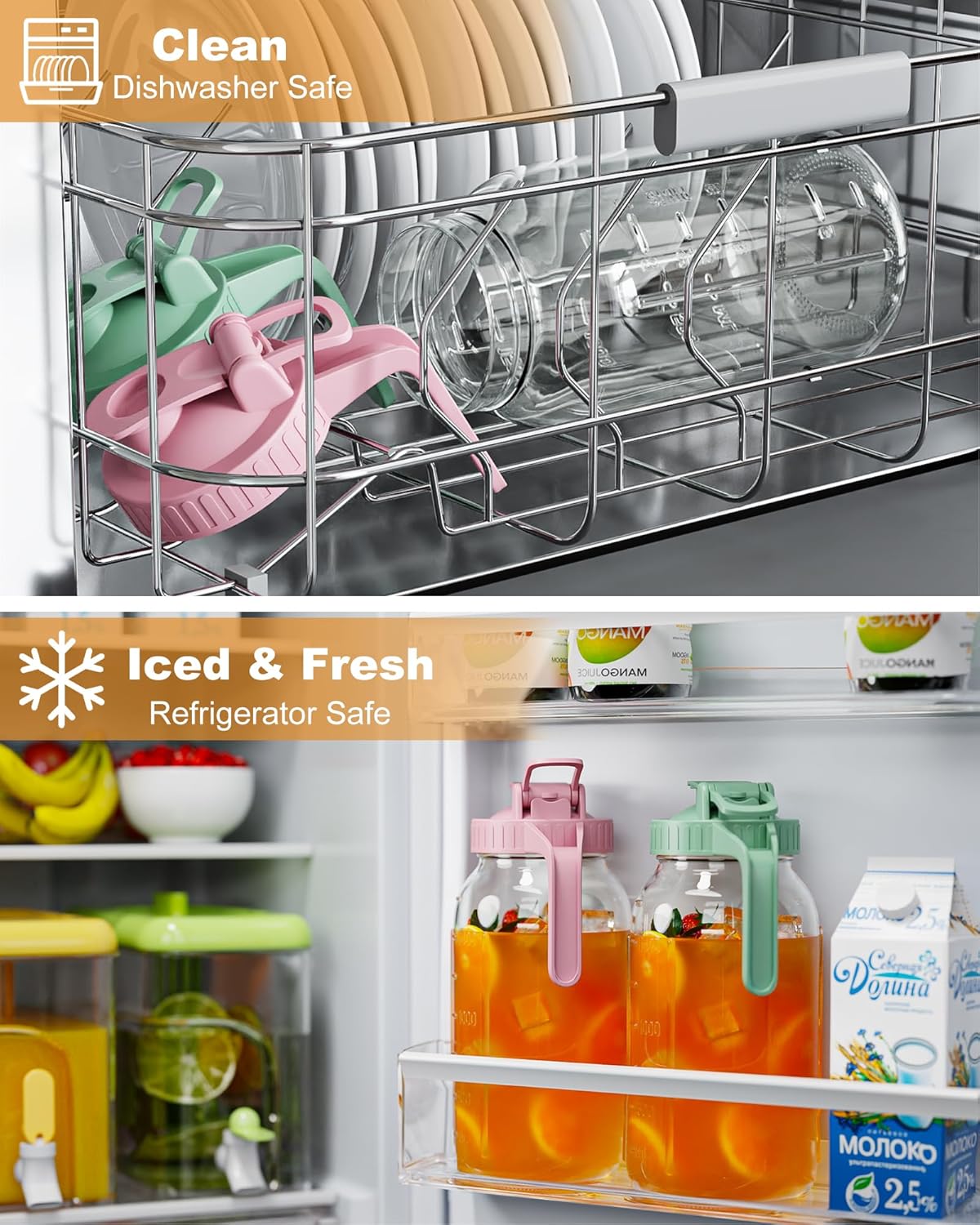 | 2 Pack | 64oz Glass Pitcher with Lid and Spout, 2 Quart (1.9 Liter) Mason Jar Pitcher Wide Mouth, Airtight Water Jug for Juice, Sun Tea, Iced Coffee, Milk Storage, Pink & Green