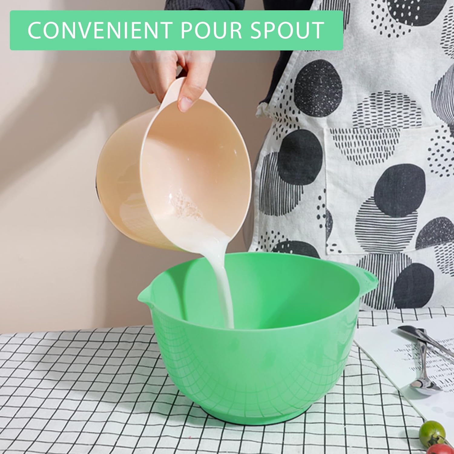 - 【Pour-Spout & Reduce the Mess】Crafted with pour spout and deep bowl design, easy for you to pour and combine liquid like milk or water into the ingredients, keeping you away from the hassles of spatters or spills. So as to make your kitchen countertop clean and tidy with ease. It is perfect for you to make a refreshing salad, prepare food, mix batters or whisk the eggs. With this mixing bowl set, elevate your cooking experience to a whole new level!