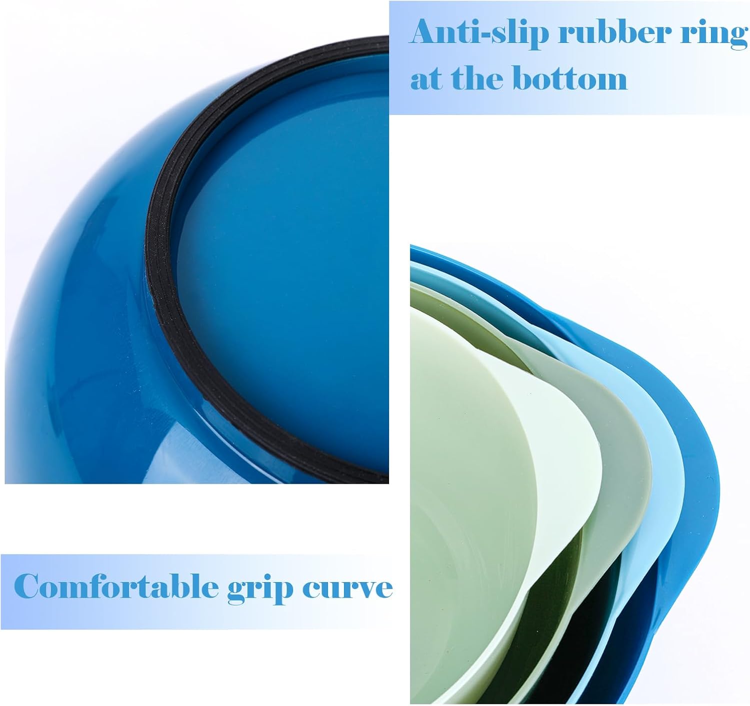 - 【Anti-Slip & Practical】There is non-slip rubber at the bottom of the plastic bowl, it can prevent slipping efficiently during the mixing. And compared with traditional mixing bowls, they are resistant to impact and lightweight enough, you will not worry about the smash, rust, or too heavy to handle at all. Versatile in use, not only does it can used as mixing bowl, double as convenient containers as fruit bowl, salad bowl, batter bowl, cereal bowl or even as popcorn bowl.
