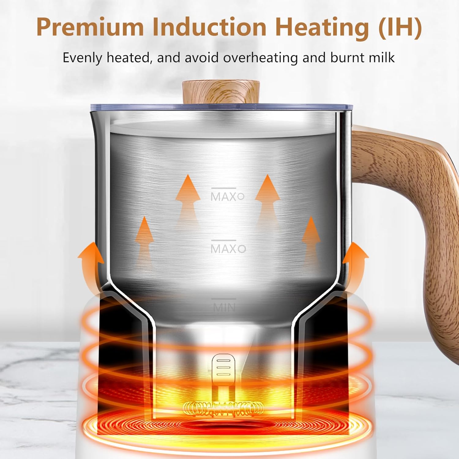 - 【Safe induction heating】Instead of traditional bottom heating, our automatic milk frother applies safe induction heating (IH) to heat ingredients in an all-round wraparound way, which is more efficiently, evenly, quietly and can avoid overheating and burnt milk. If the automatic milk frother is not operated within 60 seconds, it will enter the standby state. Safe and energy efficient, it meets your safety and quality requirements for coffee art.
