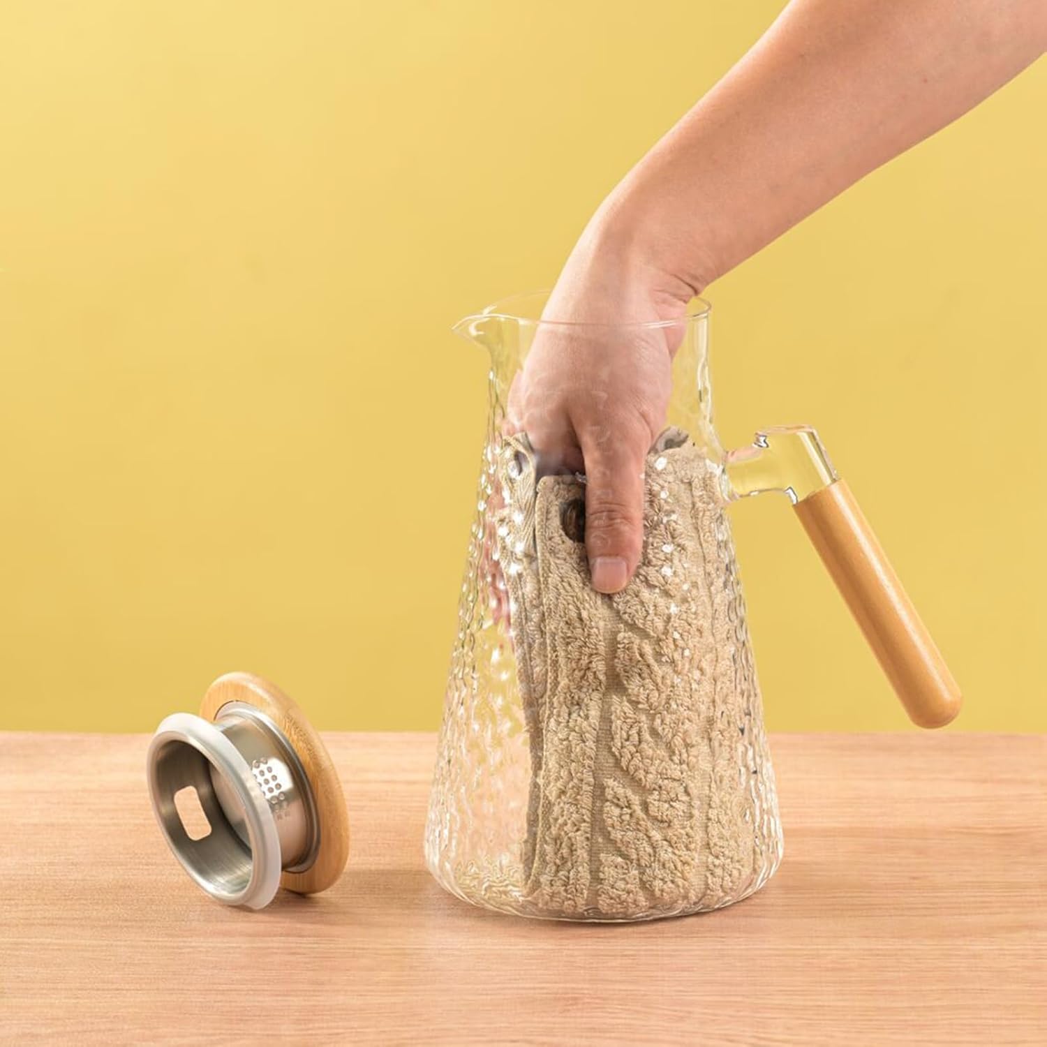 - Unique Lid: The lid surface is wooden and the bottom half is 304 stainless steel.The lid is detachable and it has two outlets, one for fast water pouring and the other for filtration, great for keeping ice,large chunks of fruit, and tea bag inside the glass pitchers with handle and lid
