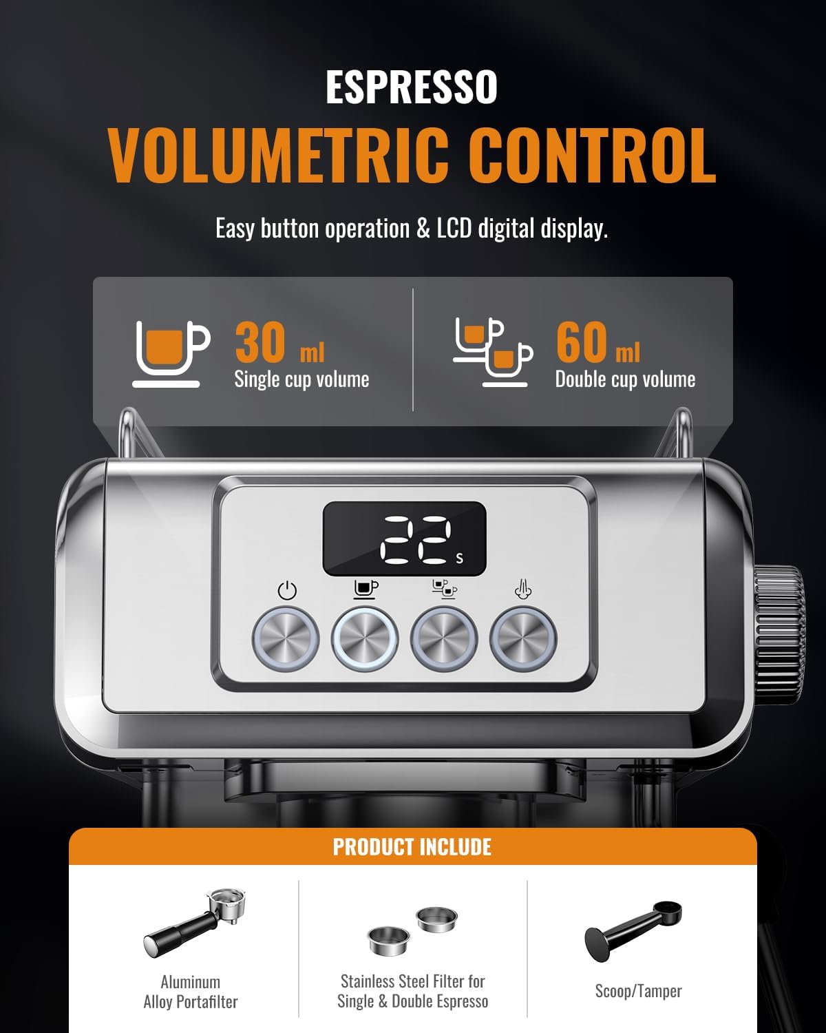 SHARDOR Espresso Machine 20 Bar with Milk Frother Steam Wand, Professional Latte & Cappuccino Maker for Home, 60 Oz Water Tank, Temperature Display, Stainless Steel, 1350W